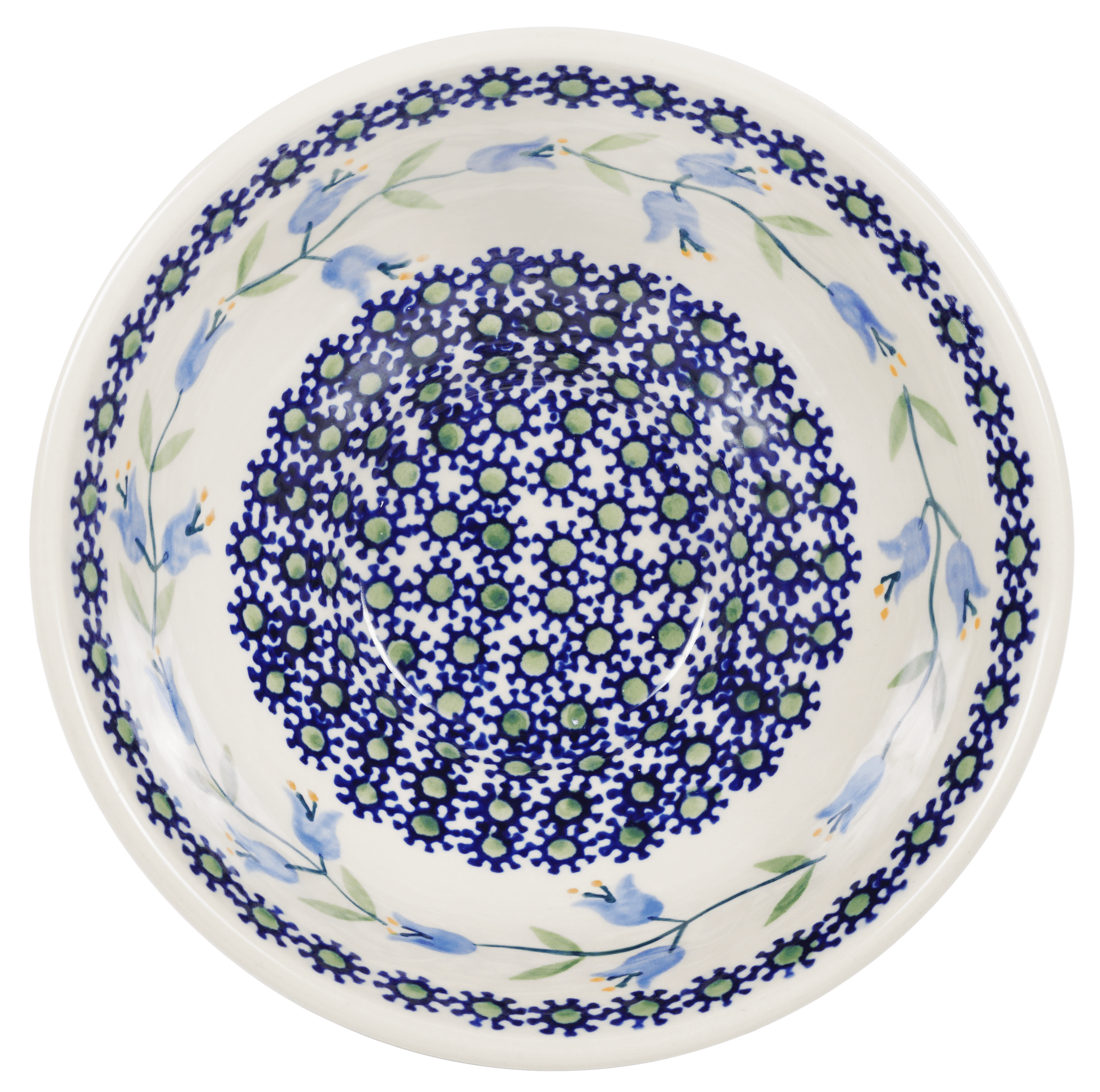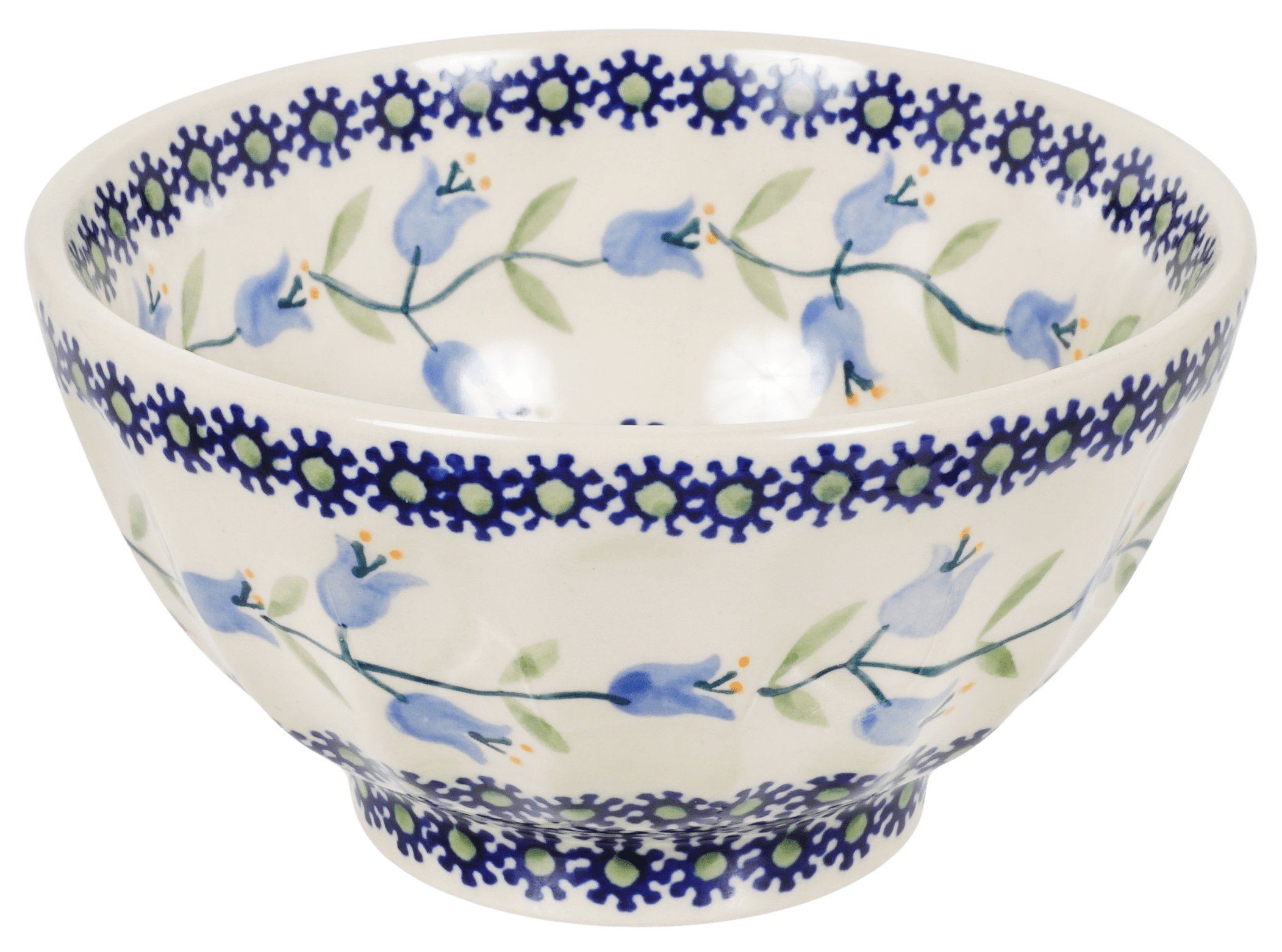 Designed to complement any setting, this Polish pottery piece sits elegantly on a narrow pedestal, broadening at the top to welcome generous servings. Its ridged edges add a sophisticated texture, making it a standout addition to any serving platter. Whether it's a casual breakfast or a formal dinner, these bowls are designed to pair perfectly with our Soup & Sandwich/Breakfast Plates. Mix and match these treasures to create a captivating tablescape that reflects your unique style and love for quality craftsmanship. The "Lily of the Valley" pattern is a testament to traditional Polish artistry, utilizing the timeless "punching" technique of hand stamping that allows each piece to tell its own floral tale.