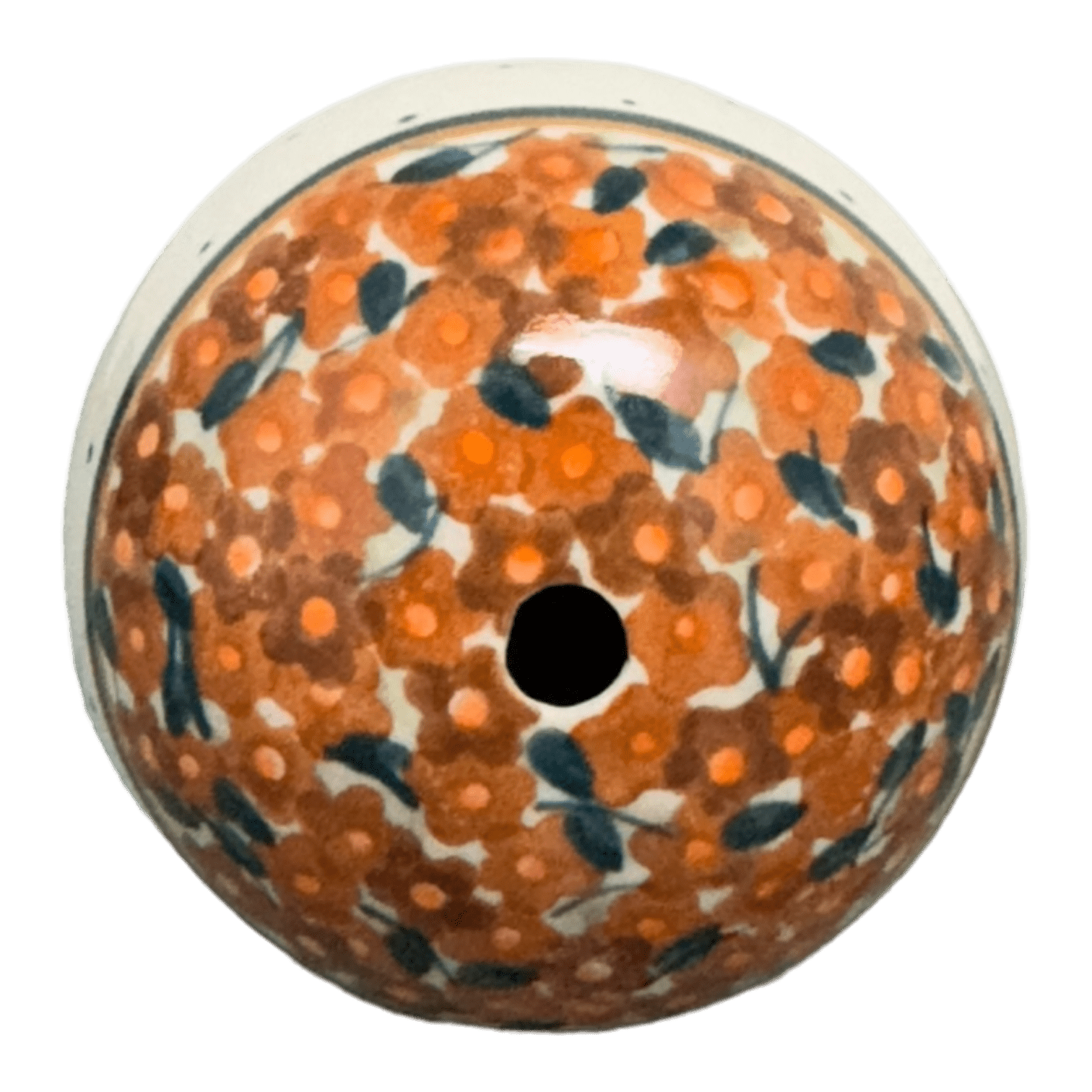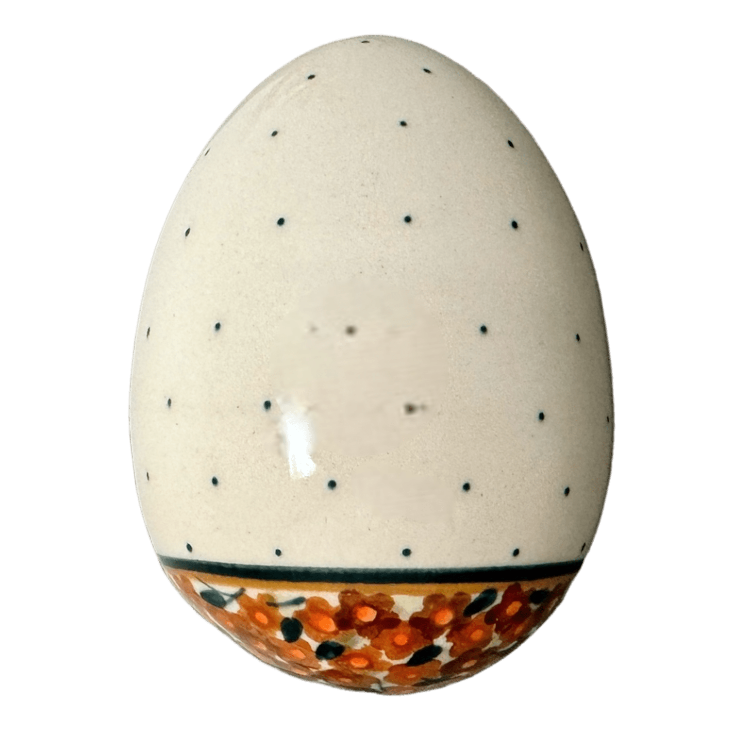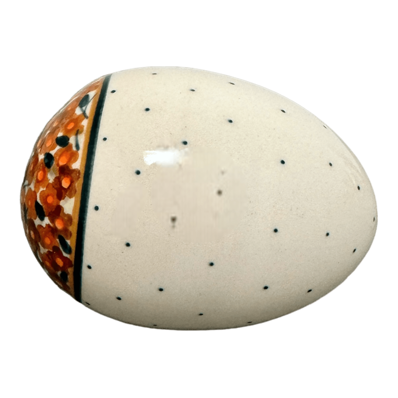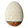Step into a world where tradition meets modern artistry with the exquisite Polish Pottery Decorative Egg from Zaklady. Handcrafted in the heart of Boleslawiec, Poland, this stunning piece stands 4.5 inches tall and is adorned with the vibrant "Orange Wreath" pattern. Picture a delicate ring of brown, orange, and gold flowers encircling lush green leaves, with a pristine white center speckled with tiny brown dots. It's not just a decorative item; it's a small treasure that brings the beauty of Polish spring right into your living room!