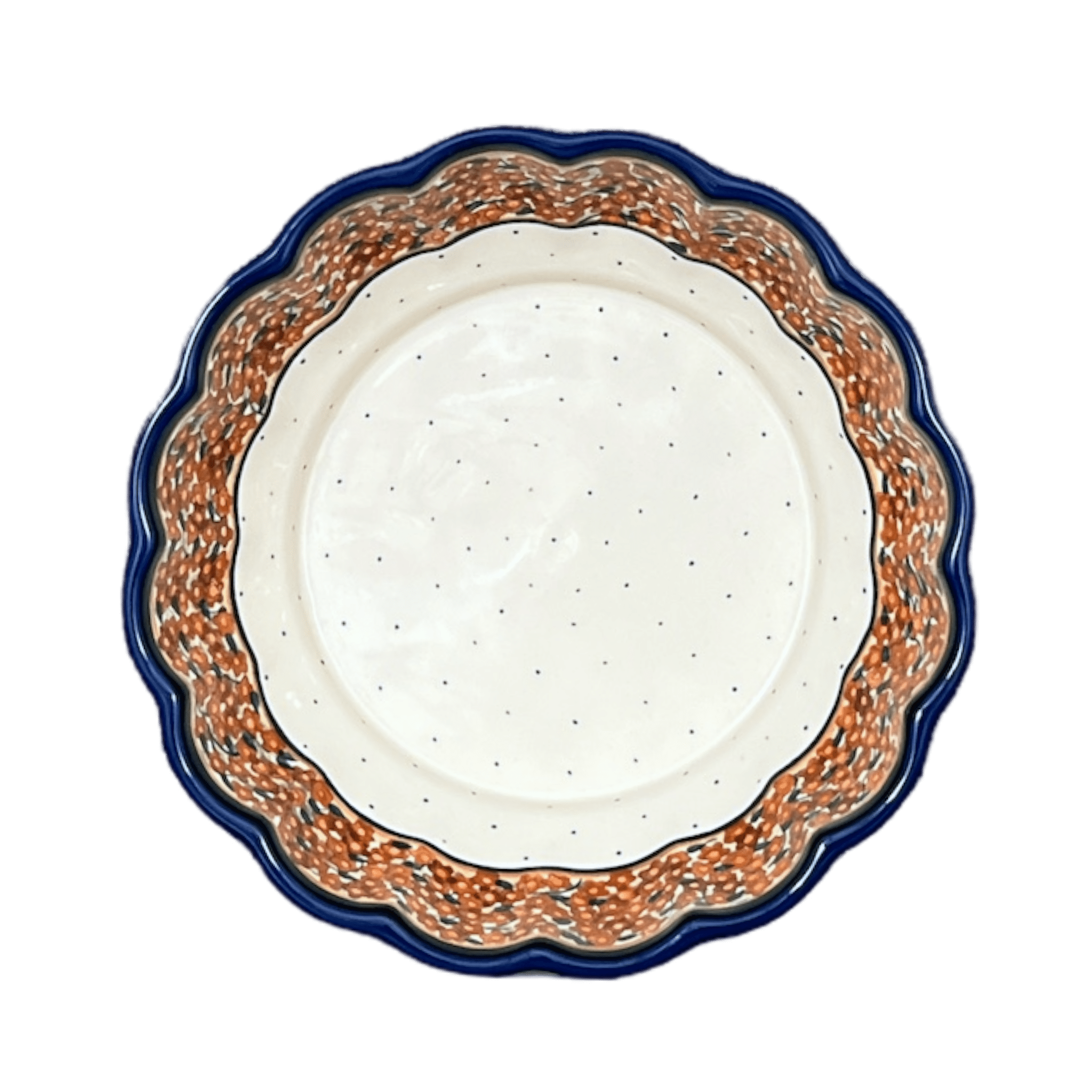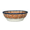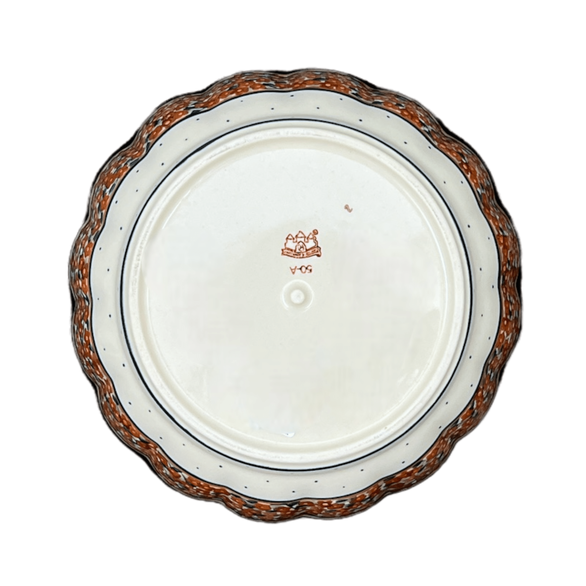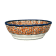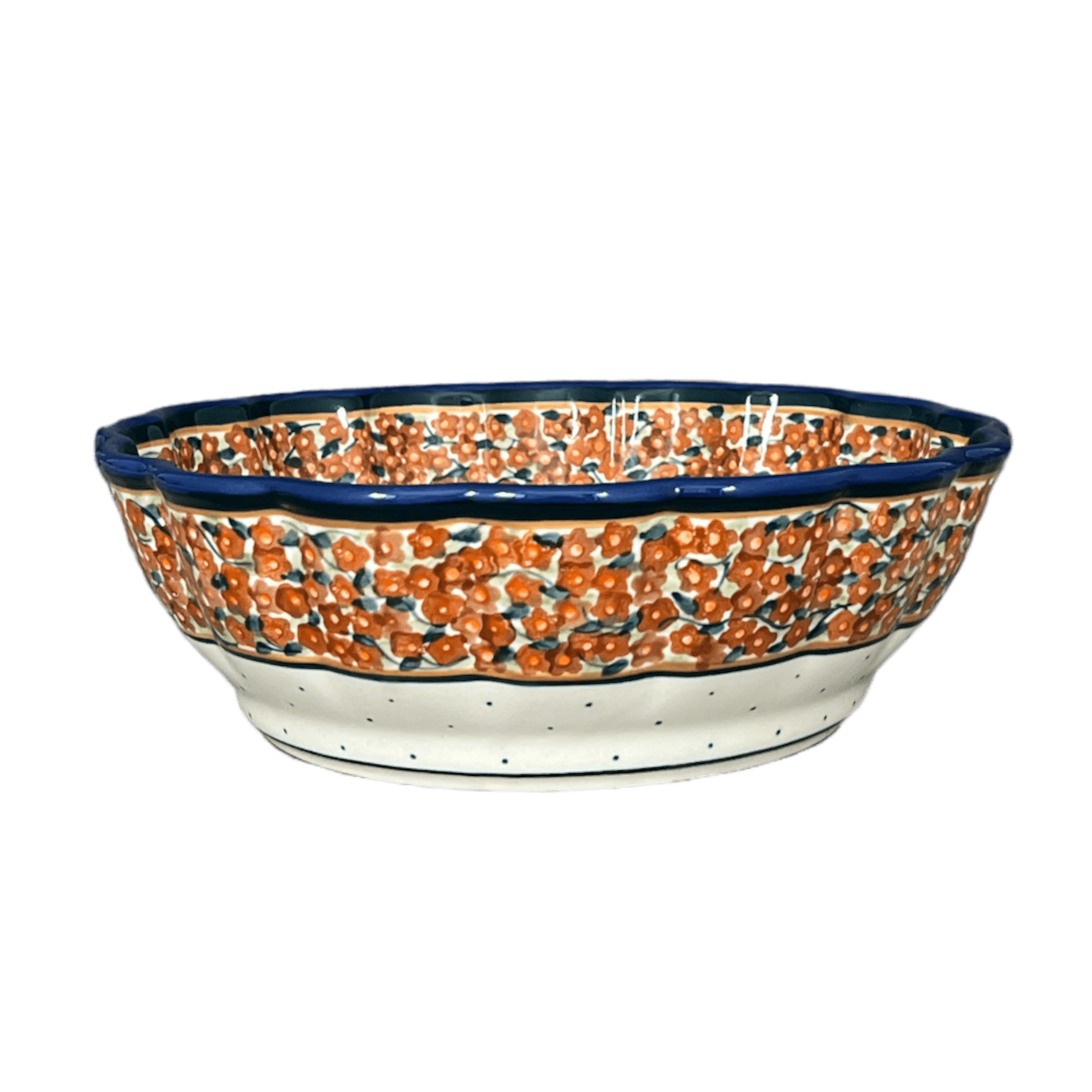 Step into a world of vibrant colors and exquisite design with the Zaklady Polish Pottery Bowl. This round, scalloped gem measures a generous 9.5 inches, perfect for showcasing your favorite side dishes in style. Each bowl is adorned with the enchanting "Orange Wreath" pattern, a masterful blend of flowers painted in hues of brown, orange, and green against a crisp white background speckled with tiny brown dots. Not just a bowl, but a centerpiece that promises to elevate your dining experience and dazzle your guests with its unique charm and sophistication.