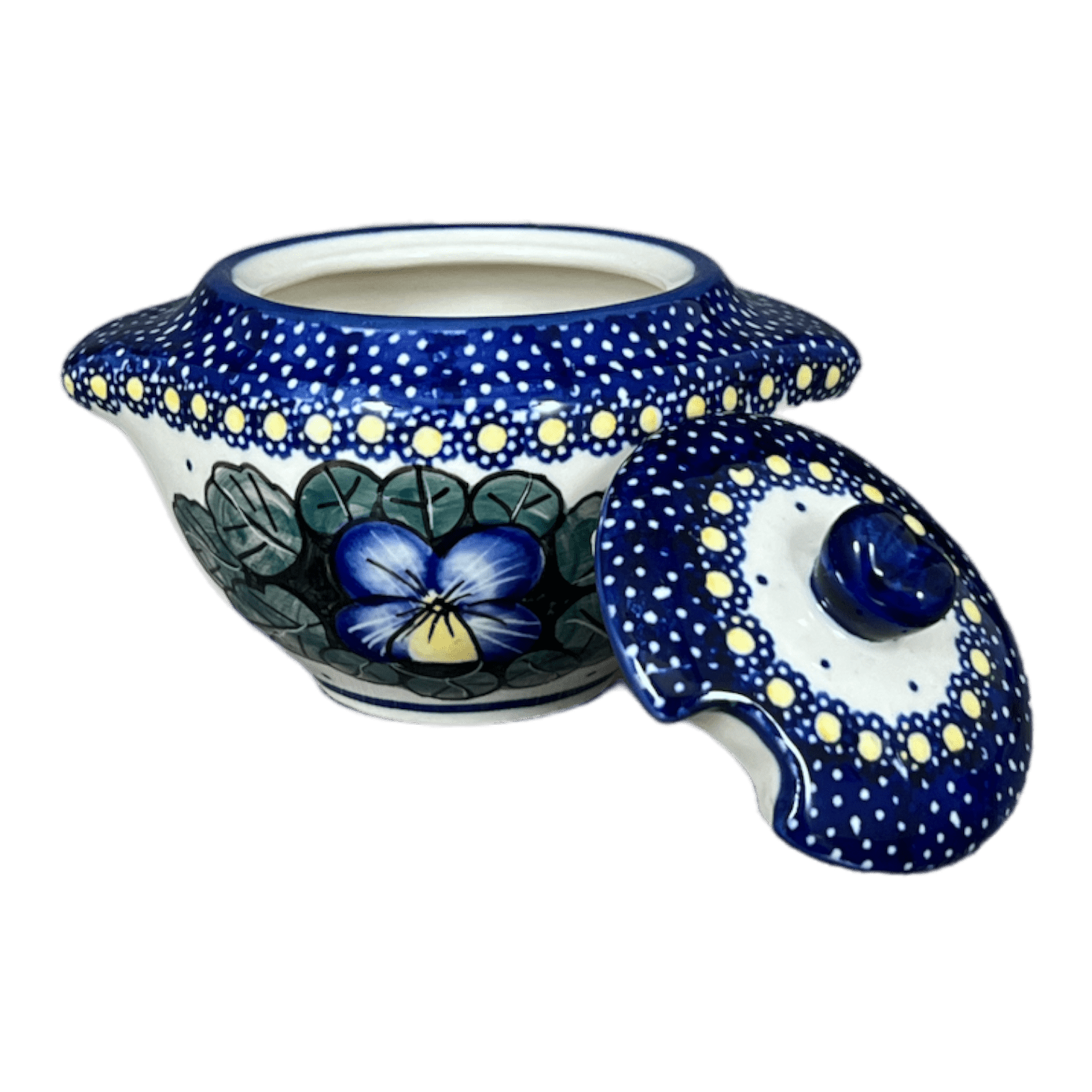 Imagine sprinkling a dash of charm and a sprinkle of artistry onto your dining table with the enchanting Manufaktura Polish Pottery Sugar Bowl. Crafted in the heart of Boleslawiec, Poland, this delightful piece isn't just a container—it's a portal to a world of floral elegance. Adorned with the 'Pansies' pattern, the bowl features exquisitely detailed blue, white, and yellow flowers nestled among teal green leaves, all highlighted by whimsical tiny blue dots. It’s not just a bowl; it’s a centerpiece that promises to steal the spotlight at your tea parties!