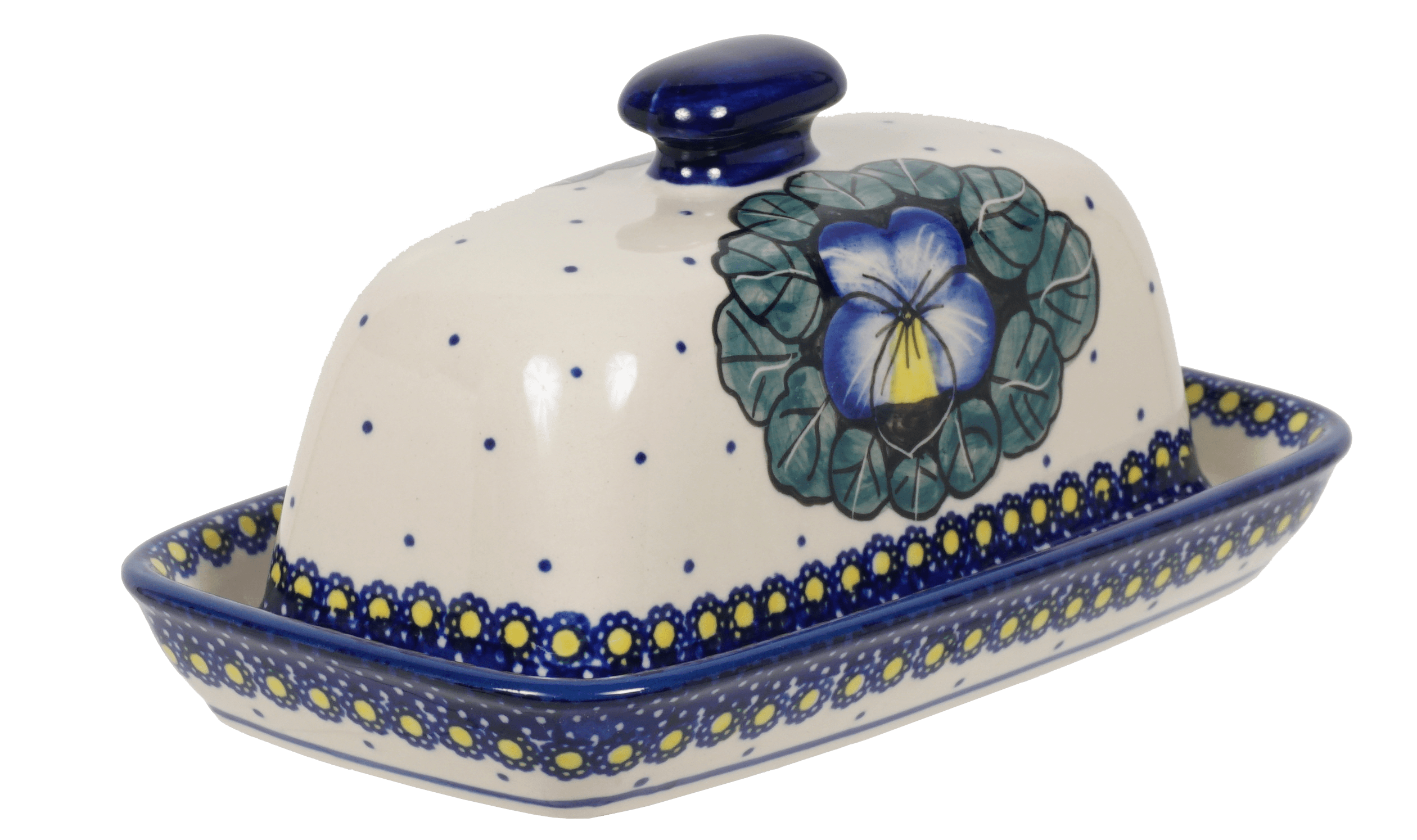 Introducing the Polish Pottery 7.5" x 4" American Butter Dish by Manufaktura in the delightful "Pansies" pattern (JZB). This butter dish is not just a functional kitchen accessory, it is an eye-catching piece of art that will add a splash of color and elegance to your home!