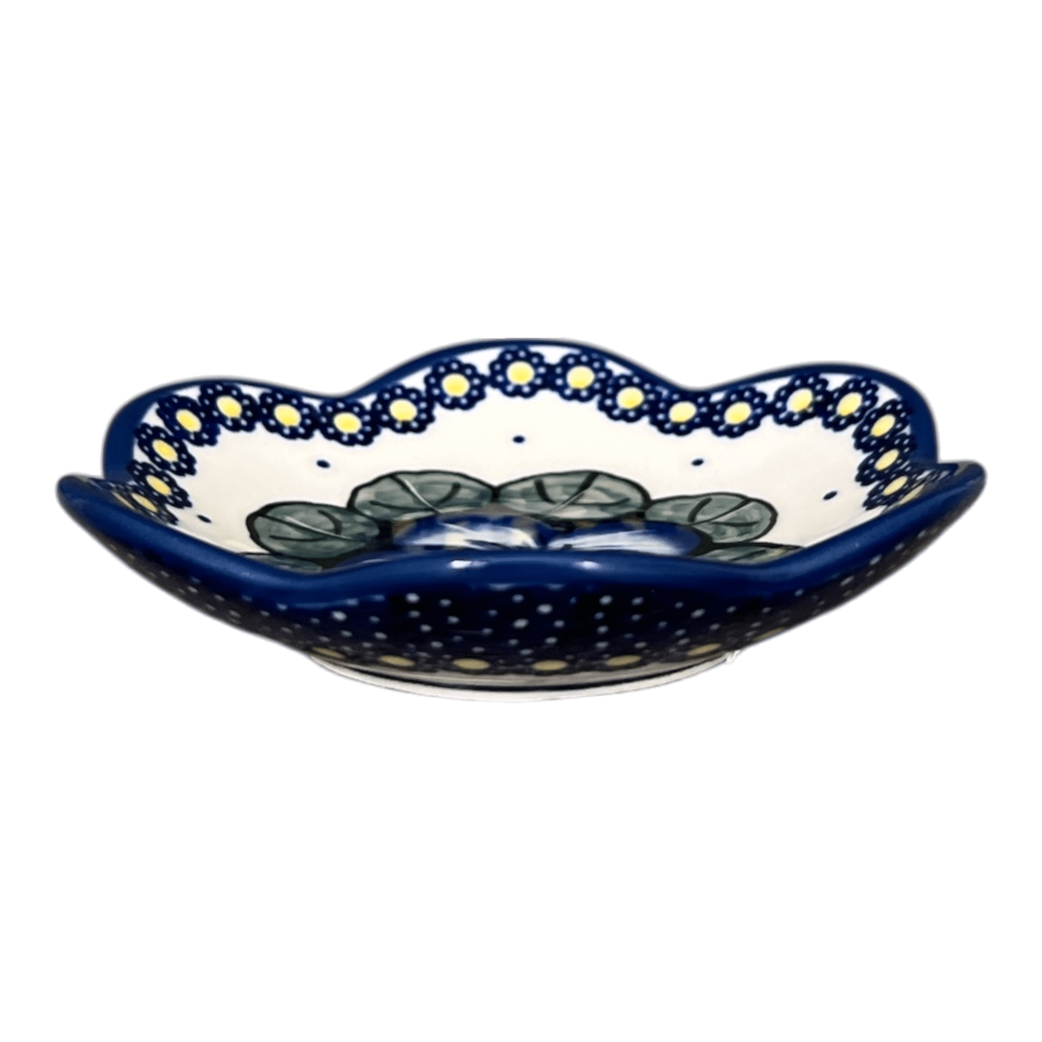 Imagine a dash of elegance and a splash of floral charm right on your bookshelf or dinner table. Enter the enchanting world of the Polish Pottery Bowl, a petite 4.25" masterpiece from Manufaktura, adorned in the delightful "Pansies" pattern. This shallow, scalloped bowl might seem unassuming at first glance, but it's a versatile treasure trove. Whether you're looking for a chic jewelry dish, a unique candle holder, or simply an eye-catching piece of decor, this bowl is guaranteed to captivate and charm. Its exquisite blend of predominantly blue hues, accented with strokes of white, green, and yellow, paints a scene as serene as a cottage garden.