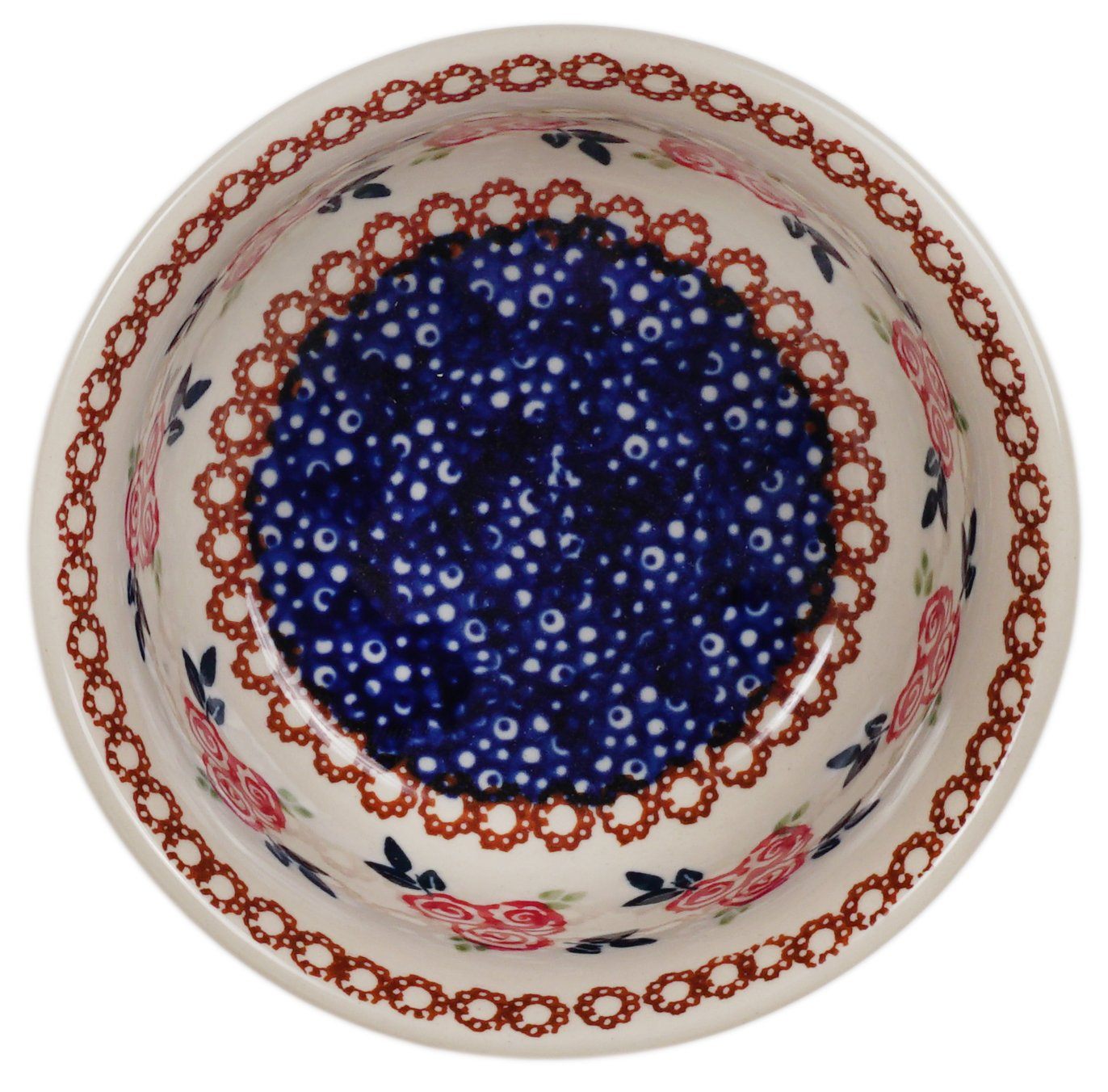 Imagine a table adorned with the exquisite charm of the Polish Pottery Bowl from Manufaktura, a delightful piece that brings both tradition and elegance to your dining experience. This 5.5" round bowl, hand-painted in the enchanting "Parade of Roses" pattern, is a perfect canvas of vibrant red roses interspersed with playful teal leaves, set against a serene blue background dotted with whimsical white rings. Ideal for serving everything from a hearty soup to a refreshing salad, or even your favorite dessert, this bowl transforms every meal into a festive celebration.