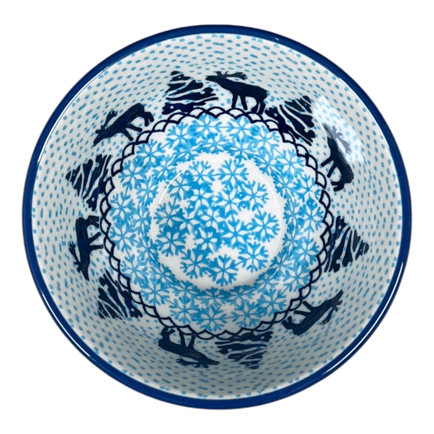 Introducing the exquisite Polish Pottery Bowl from Manufaktura, a must-have for any discerning tableware collector! Crafted in the enchanting "Peaceful Season" pattern, this bowl is not just a vessel for your favorite dishes but a piece of art. Standing 5.5 inches in diameter and 3 inches tall, this versatile bowl is perfect for everything from a hearty soup to a refreshing ice cream sundae. The "Peaceful Season" design features a whimsical winter scene with large dark blue moose and Christmas trees encircling a flurry of light blue and white snowflakes, all set against a crisp white background. It's a traditional Polish pattern that captures the serene beauty of the winter season, making it an ideal addition to your festive table decor.
