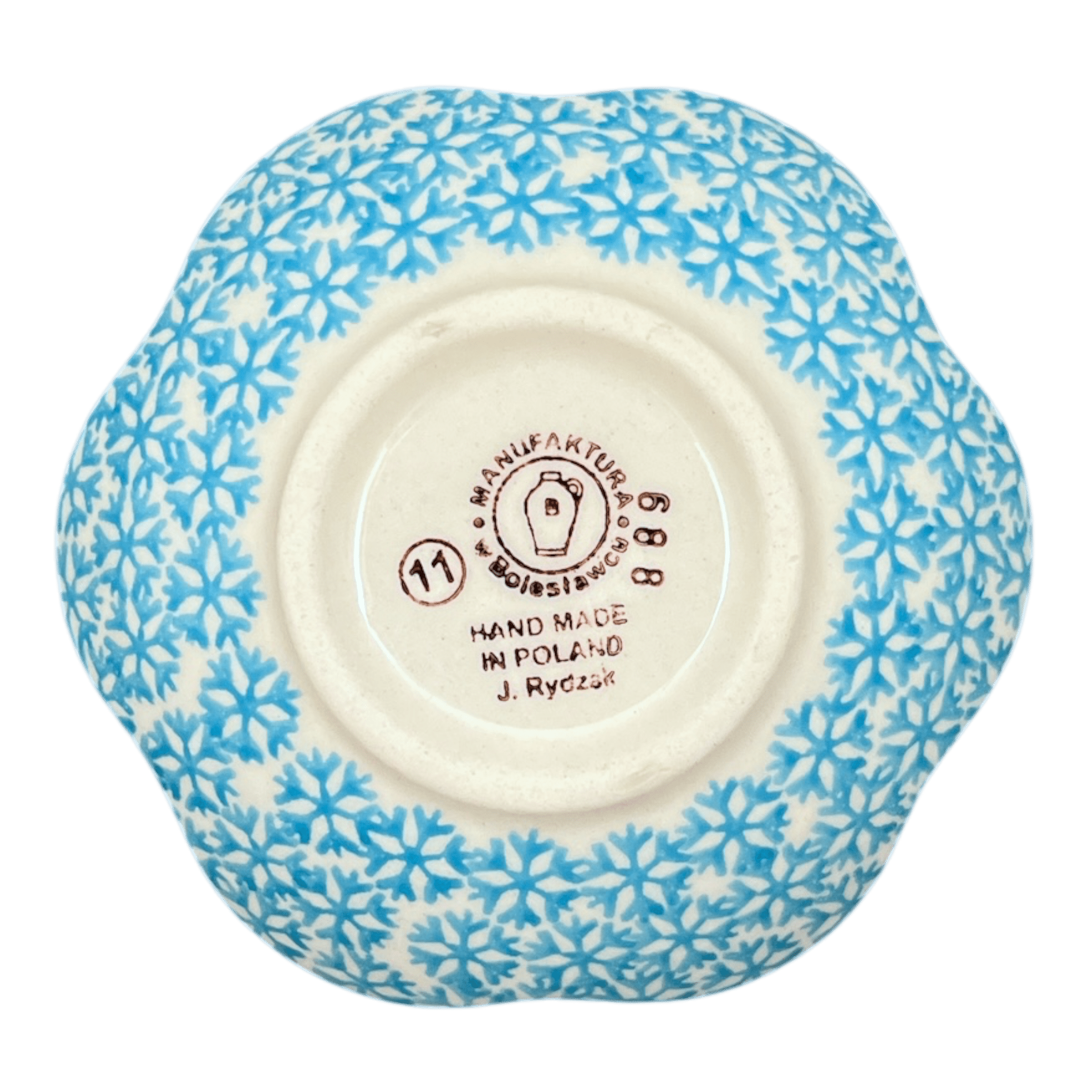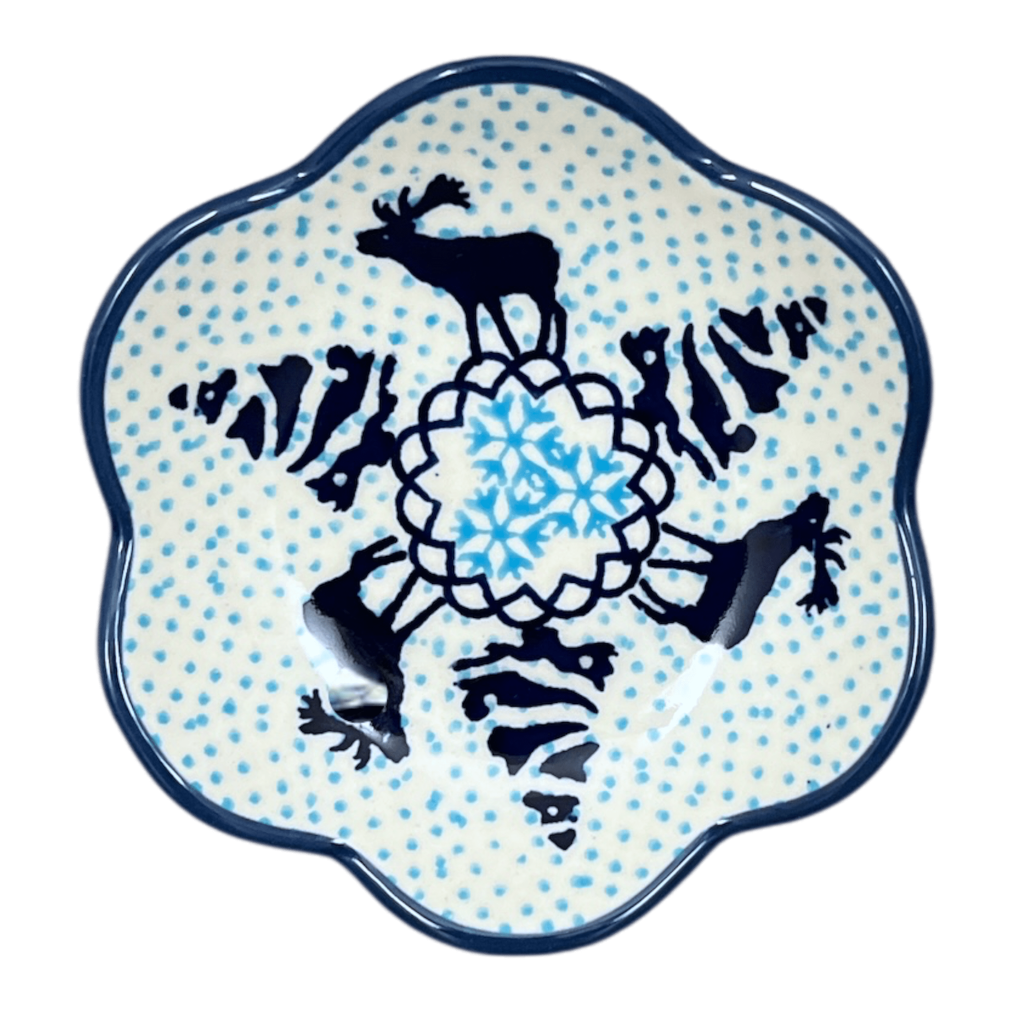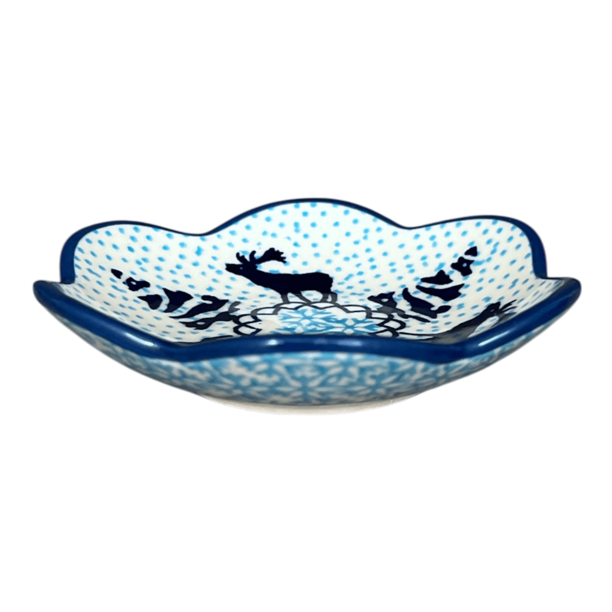 Discover the enchanting charm of the Polish Pottery Bowl from Manufaktura, a delightful addition to any home. This shallow, scalloped bowl, measuring a quaint 4.25 inches, is a versatile treasure that can serve as a jewelry dish, a unique candle holder, or a chic piece of bookshelf decor. Crafted in the serene "Peaceful Season" pattern, this bowl features a whimsical design with Christmas and moose motifs set against a predominantly light blue backdrop, accented by dark blue and white. The center dazzles with light blue and white snowflakes, while large dark blue moose and Christmas trees create a festive border, sprinkled with tiny light blue dots that fill the space, bringing a touch of winter wonderland into your home.
