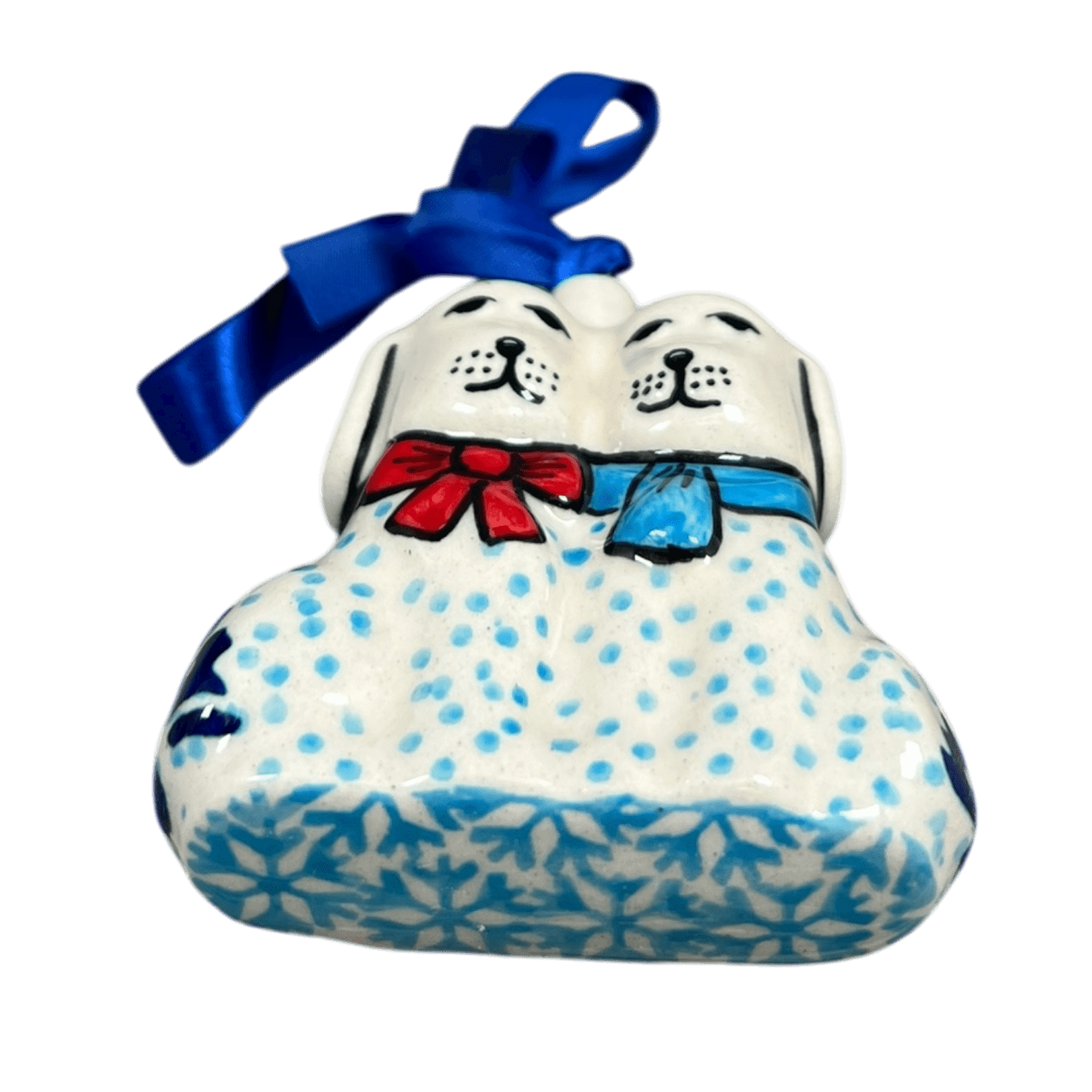 Imagine hanging a little piece of art right from your festive tree this season! Introducing the charming Polish Pottery Ornament in the "Peaceful Season" pattern by Manufaktura. Picture a snowy landscape distilled into a 2.5" puppy dog ornament, where moose and Christmas trees dance around in a wintery ballet painted in soothing shades of light and dark blue, set against a crisp white background. Each ornament is a portal to a tranquil winter wonderland, making it not just a decoration but a tiny escape to a serene, snowy forest.