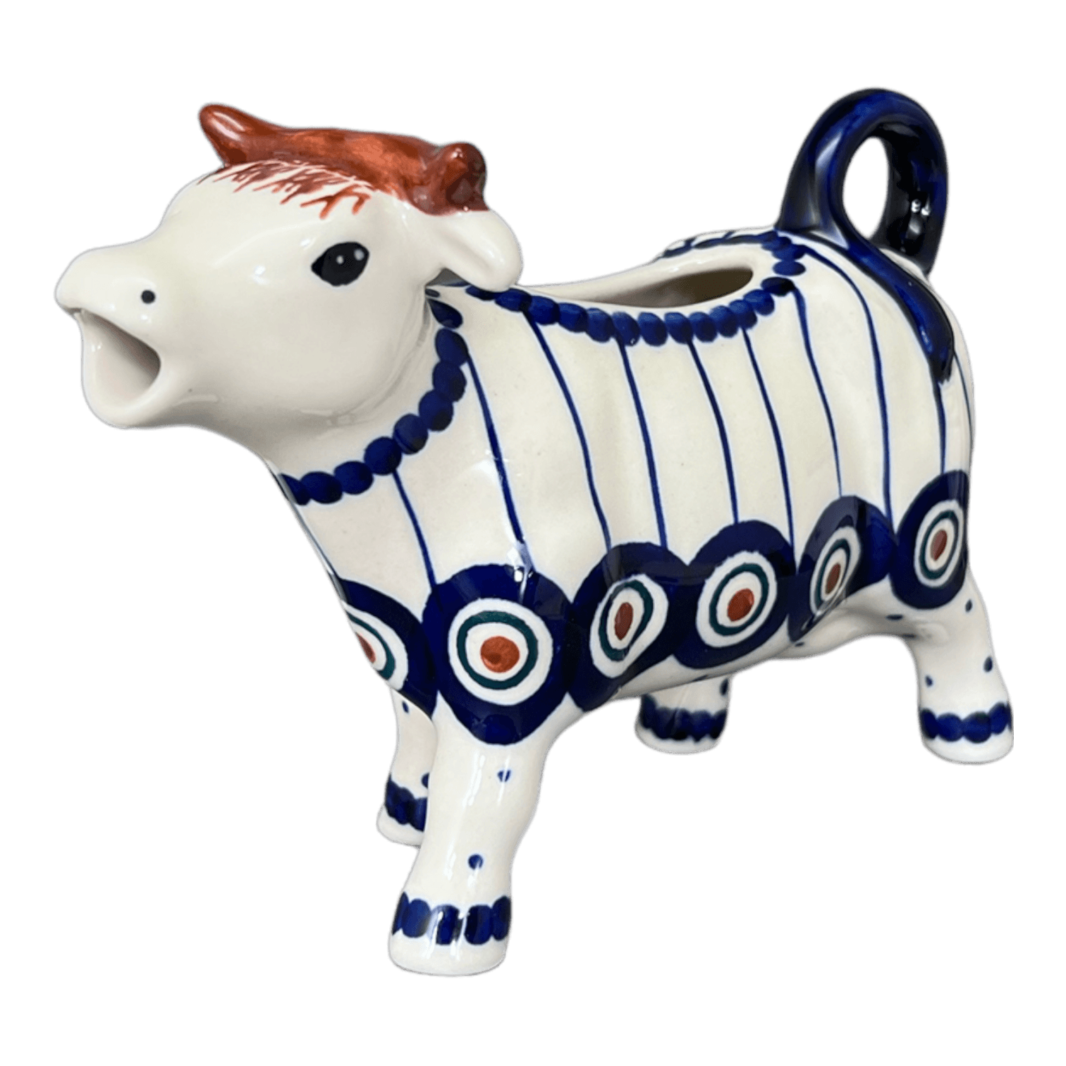 Introducing the Polish Pottery 4 oz. Cow Creamer by Manufaktura in the captivating "Peacock in Line" pattern (54A). This creamer is not just your ordinary kitchen accessory - it's udderly fun, fun, fun, and truly moooooving! Imagine pouring cream straight from the cow's mouth and adding a touch of whimsy to your morning coffee or tea.