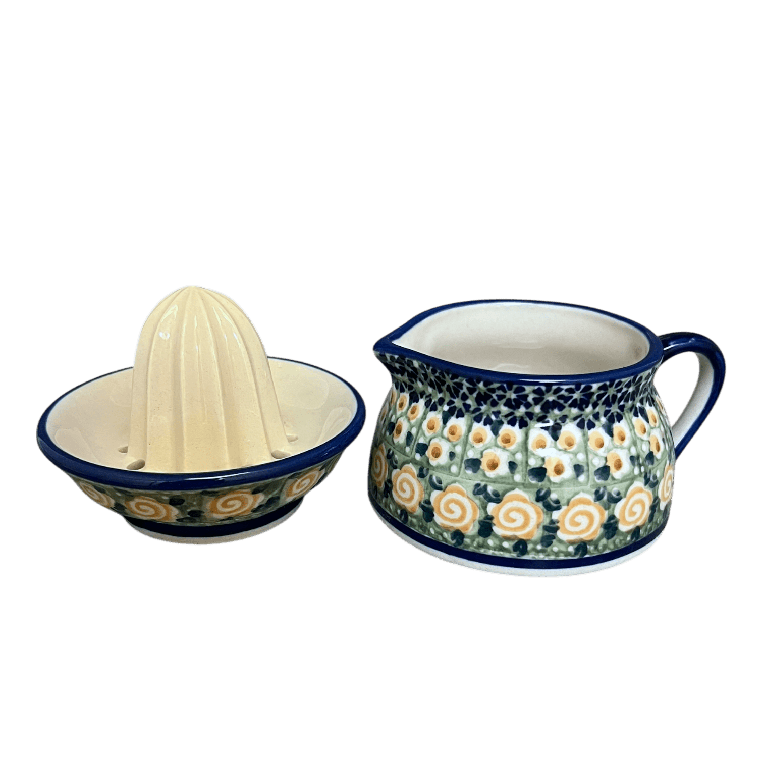Beyond its stunning appearance, the Polish Pottery Juicer is designed to withstand the demands of a modern kitchen. It is safe for use in the dishwasher, microwave, freezer, and oven (up to 425 degrees), making it as versatile as it is beautiful. Constructed from high-quality, durable Polish clay, it is free from lead, nickel, and cadmium, ensuring that it is as safe as it is durable. Whether you're squeezing a fresh lemon for your morning tea or preparing a jug of citrus for a family brunch, this juicer set promises not only utility but also a splash of color and a story of exceptional craftsmanship with every use.