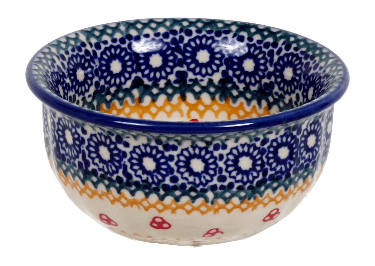 Introducing the enchanting "Ruby Bouquet" Polish Pottery Bowl from Manufaktura—a masterpiece that blends functionality with exquisite artistry. This charming 3.5-inch round bowl is not just any ordinary dish; it's a canvas showcasing the vibrant and intricate "Ruby Bouquet" pattern. Picture a snowy white backdrop sprinkled with tiny blue and small orange flowers, dominated by larger, vivid red blossoms. A delicate chain of blue flowers gracefully lines the rim, adding a touch of elegance. Whether used as a ramekin or a dipping bowl, this piece is sure to captivate and add a splash of color to any table setting.