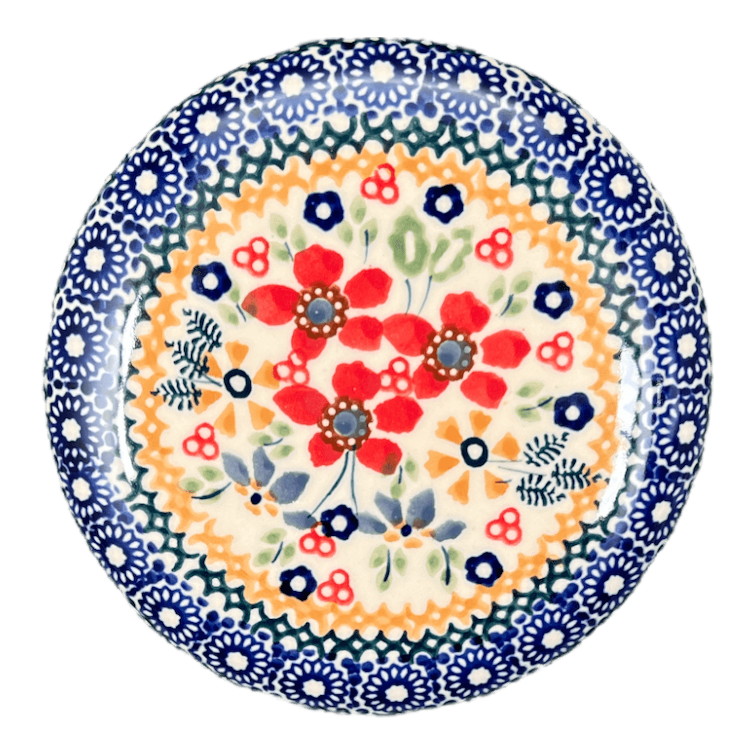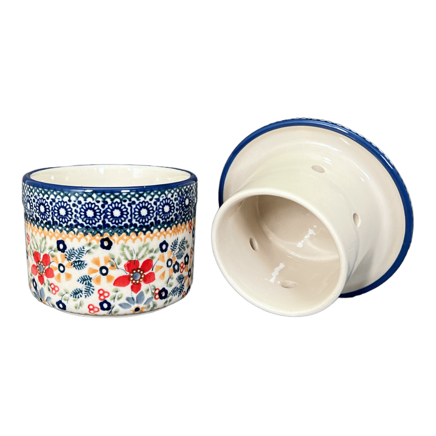 But let’s talk style – the "Ruby Bouquet" pattern of this crock is nothing short of a masterpiece. A white canvas bursts into life with tiny blue blossoms, playful orange florals, and bold red flowers, all accented with hints of gold. Each crock features a delicate chain of blue flowers that gracefully lines the edge, encapsulating the essence of a vibrant, blooming garden. As a Signature piece, this pattern bears the exclusive "UNIKAT" stamp on the bottom, along with the artist's signature, signifying its authenticity and limited availability. The artists behind these designs are masters of their craft, personally overseeing the production from start to finish, making each butter crock a collector’s delight and a functional piece of art.