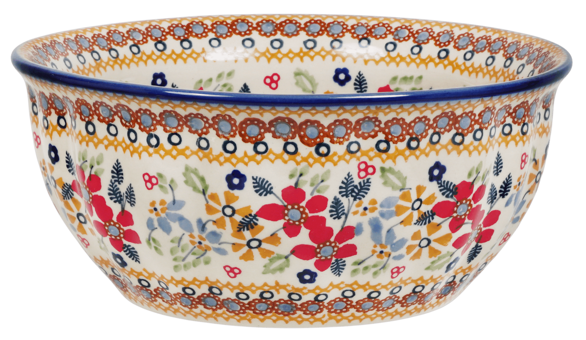 Imagine serving your next dinner in a masterpiece of color and craft, the Manufaktura 7.75" Polish Pottery Bowl. This isn't just any bowl; it's a canvas showcasing the vibrant "Ruby Duet" pattern, a symphony of red, gold, and white accents dancing around blue floral clusters. Crafted in the heart of Boleslawiec, Poland, this bowl transforms every meal into a festive occasion, perfect for anything from a refreshing salad to a hearty pasta.