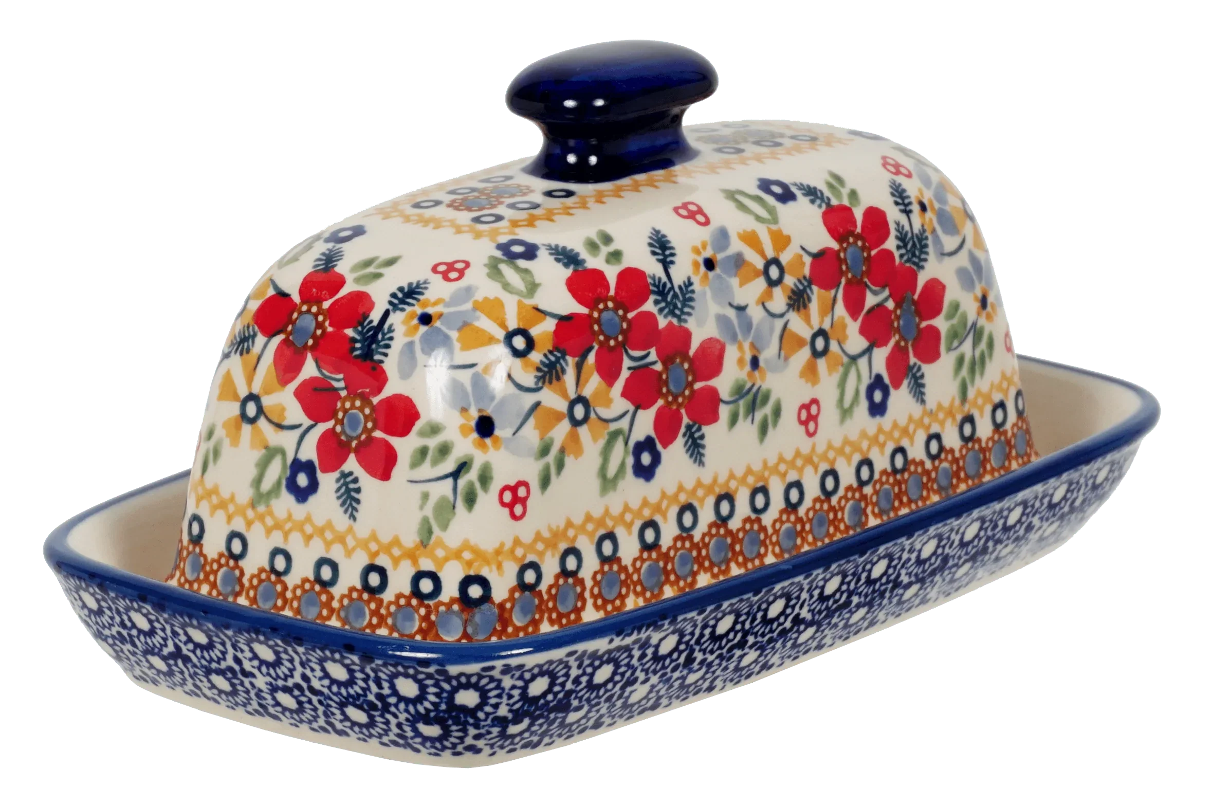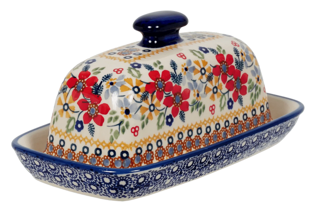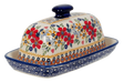 Introducing the Polish Pottery 7.5" x 4" American Butter Dish by Manufaktura, a stunning addition to your kitchen that will make your stick of butter or margarine feel right at home! This eye-catching butter dish comes in the vibrant "Ruby Duet" pattern, featuring a delightful fusion of flowers in a predominantly red color, with accents in gold, white, and blue. With its unique design elements, this butter dish is sure to be a conversation starter at your next gathering.