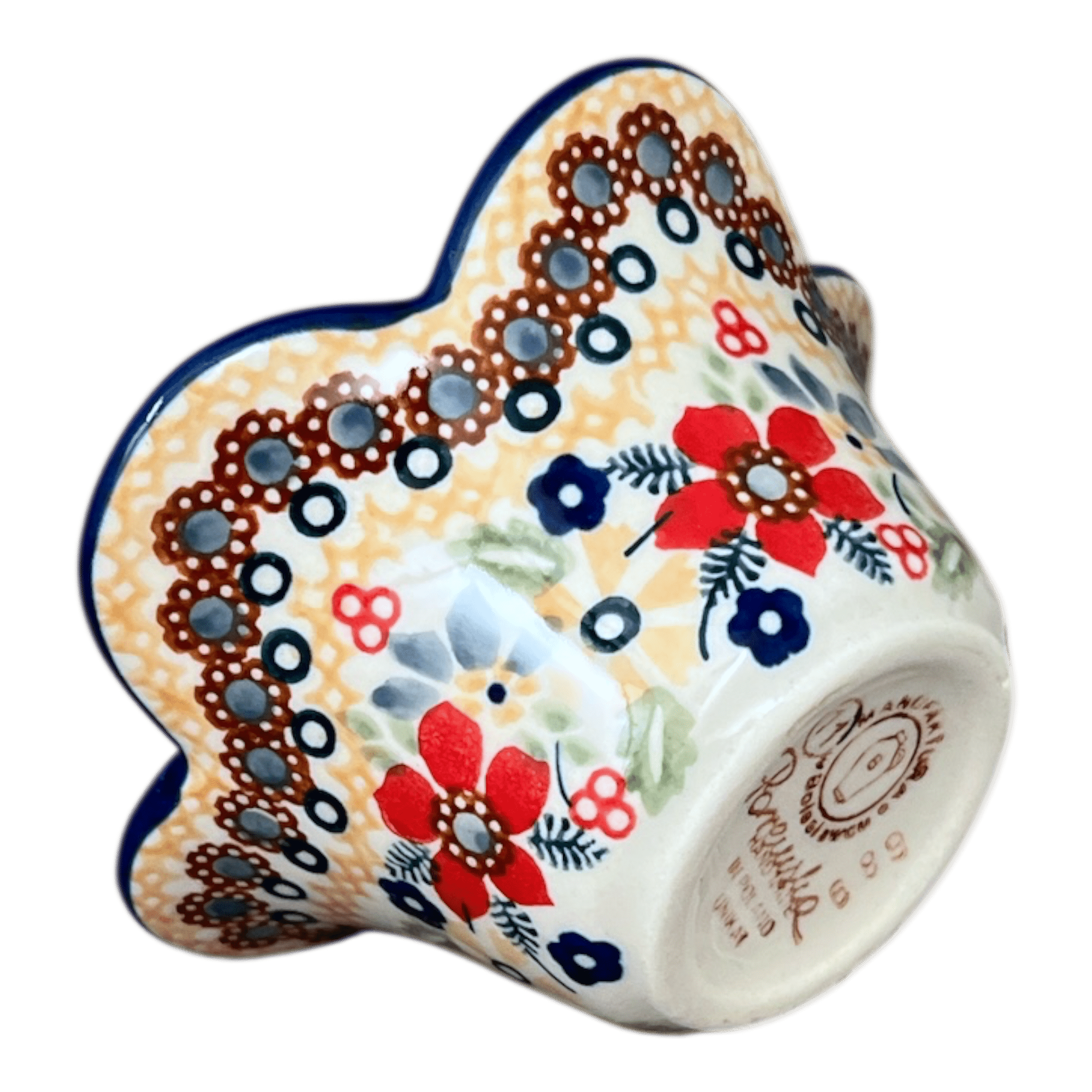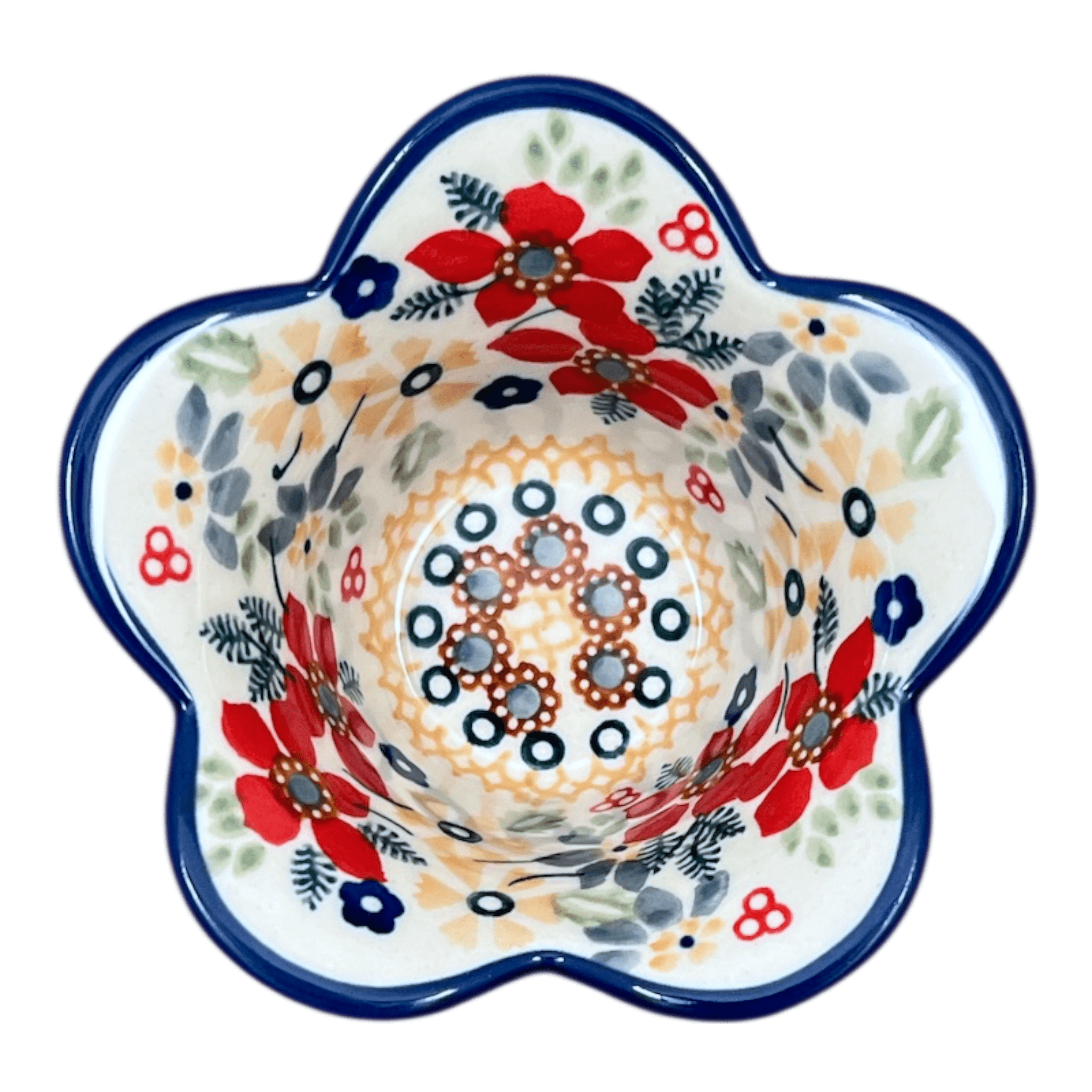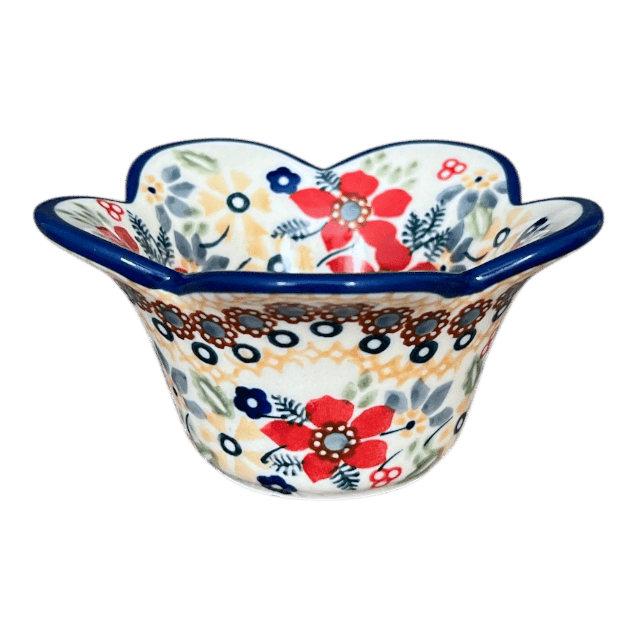 Introducing the enchanting "Ruby Duet" scalloped bowl from the renowned Manufaktura workshop, a delightful piece of Polish pottery that promises to elevate your home decor with its artistic flair and versatile functionality. Picture this exquisite bowl on your dining table, serving as a sophisticated charcuterie board bowl, or imagine it on your nightstand, elegantly collecting your cherished trinkets. Alternatively, use it to house a flickering votive candle, casting warm, inviting light across any room. This 2-inch scalloped gem, adorned with a captivating pattern of densely clustered blue flowers set against a crisp white background, surrounded by a lively chain of red, orange, and blue blooms, is not just a bowl, but a conversation starter.