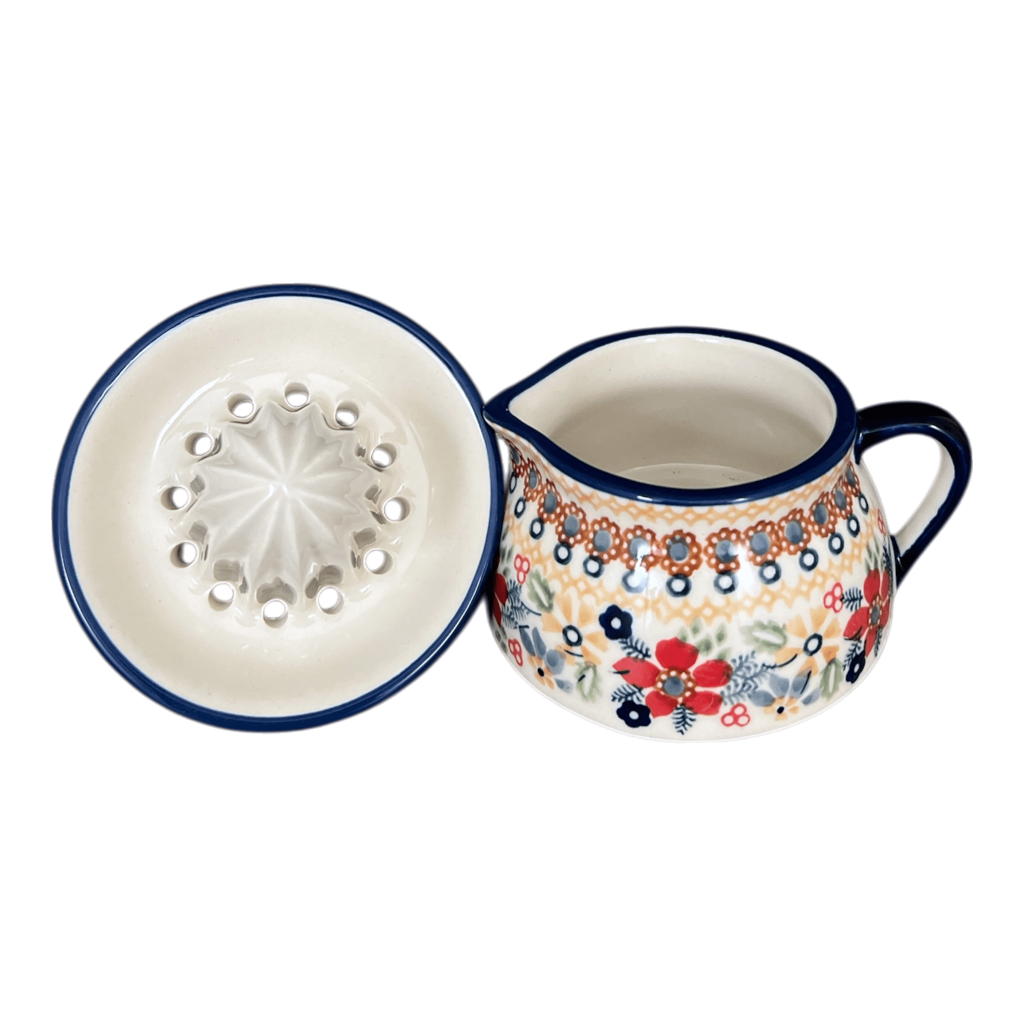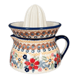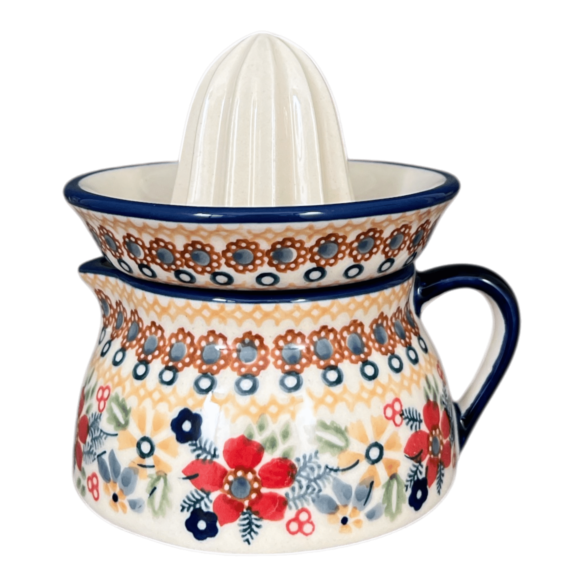 Introducing the exquisite Polish Pottery Juicer with Jug from Manufaktura, a gem in the "Ruby Duet" pattern that transforms the mundane task of juicing into a delightful experience. Crafted from high-quality Polish clay, this charming juicer stands at a compact 4.5 inches, making it a perfect fit for any kitchen counter. The juicer is not just a tool but a piece of art, featuring vibrant red and gold flowers set against a crisp white background with blue floral accents, evoking the beauty of a blooming garden. This piece isn’t just about aesthetics; it’s designed to ream your fruit efficiently, ensuring that every drop of juice is captured in the accompanying stylish jug.