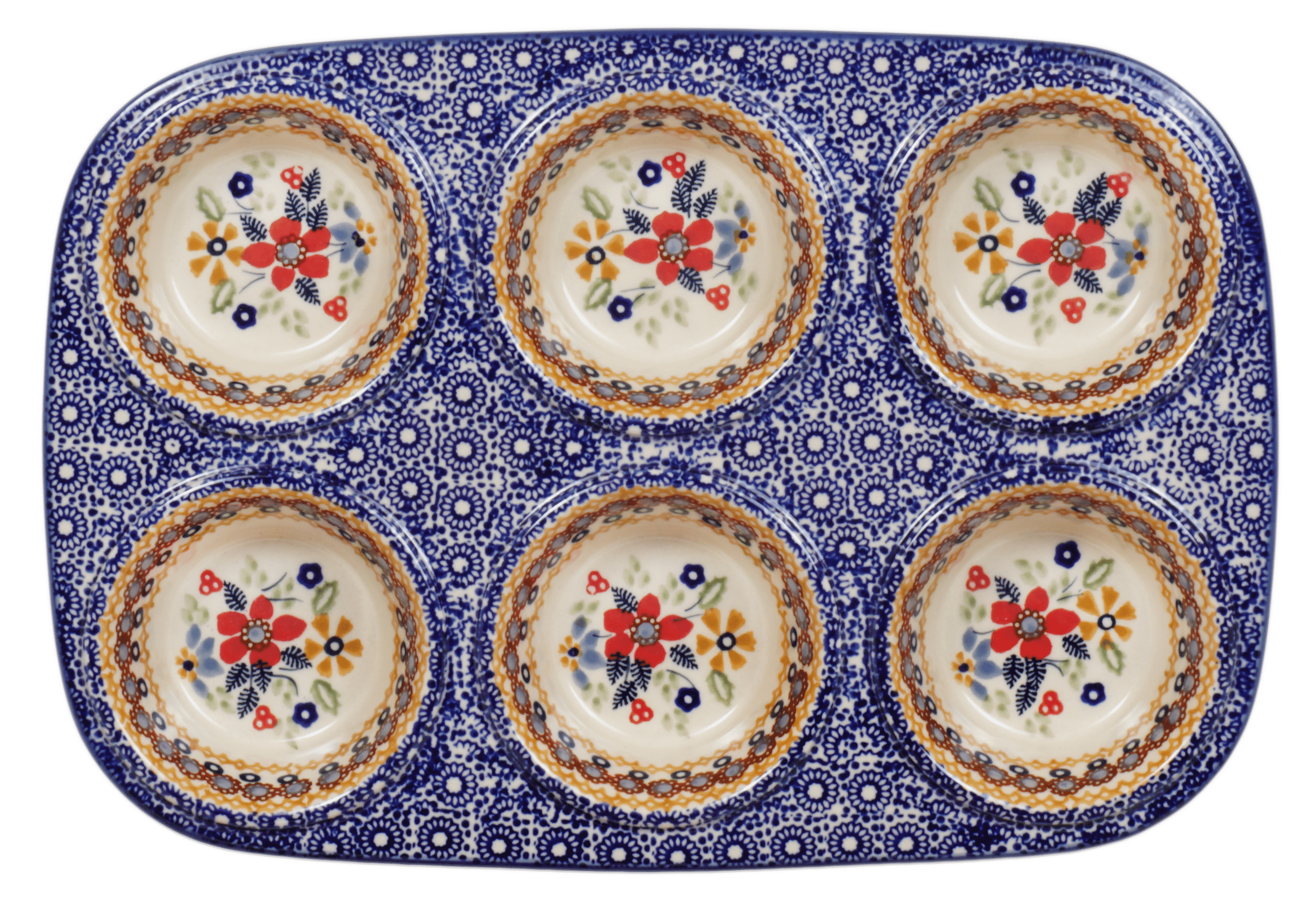 Imagine whipping up your favorite muffins or cupcakes in a piece of art so vibrant it could be hung on the wall! Introducing the exquisite Polish Pottery Muffin Pan, measuring a versatile 8.5" x 12.5", crafted by the renowned artisans at Manufaktura in the stunning "Ruby Duet" pattern. This eye-catching design features a delightful symphony of flowers, predominantly in red, with elegant gold, white, and blue accents dancing across a crisp white background. Each flower is meticulously painted by hand, transforming every baking moment into an artistic experience. Whether it’s a batch of gooey chocolate muffins or light, airy cupcakes, this pan turns each baking endeavor into a celebration of beauty and taste.