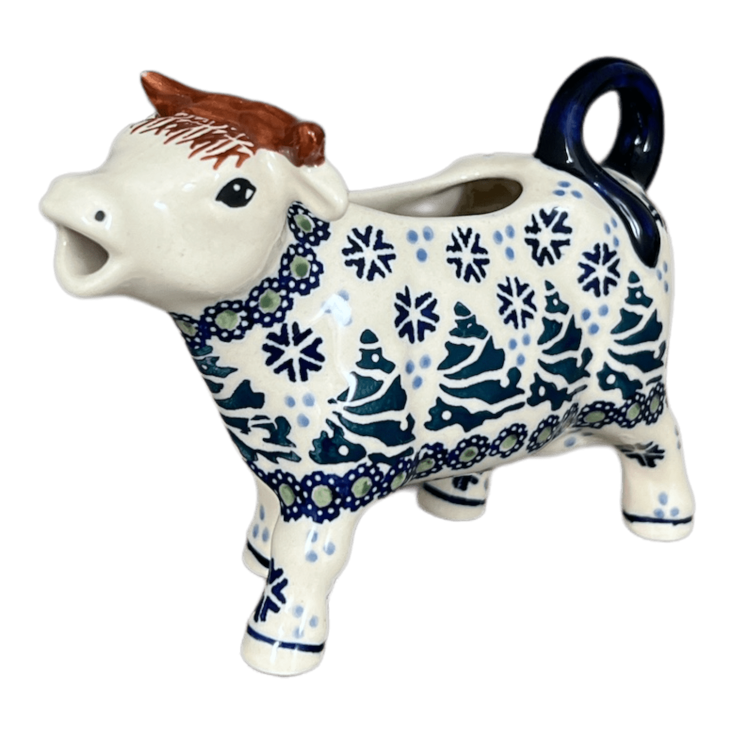 Imagine a chilly, enchanting winter evening as you pour your favorite cream into your coffee or tea from the delightful Polish Pottery Creamer. This isn't just any creamer; it's a miniature masterpiece, shaped like a charming cow and meticulously crafted by the renowned artisans of Manufaktura. Decorated in the mesmerizing "Snowy Pines" pattern, this creamer captures the serene essence of a snowy Christmas with its vivid blues and festive green accents. Each piece is a portal to a winter wonderland, featuring tiny white dots that resemble gently falling snowflakes, and a cozy band of teal Christmas trees wrapped around its middle.