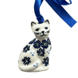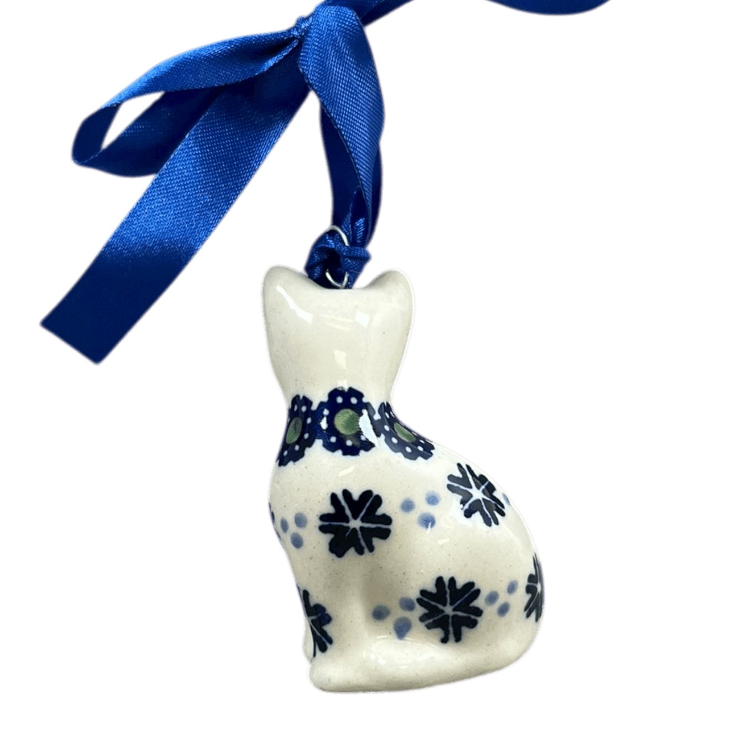 Introducing the enchanting Polish Pottery Ornament, shaped like a delightful cat, from the renowned Manufaktura workshop! This 1.5-inch treasure is meticulously crafted in the charming "Snowy Pines" pattern, depicting a serene winter wonderland. The design features a splendid blue backdrop speckled with tiny white dots, encircled by a ribbon of teal Christmas trees on a pristine white canvas. Above, bands of simple yet elegant blue snowflakes dance across the sky, creating a picturesque scene that captures the spirit of the holidays. This ornament is the perfect blend of whimsy and tradition, making it an irresistible pick for any cat aficionado or collector of fine ornaments.