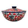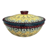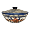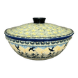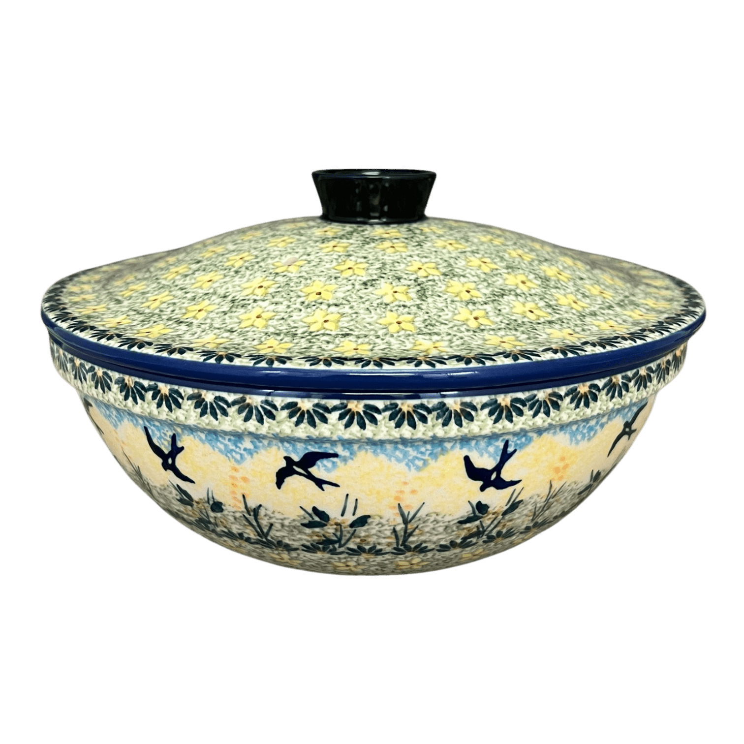 Imagine a masterpiece of pottery that not only captivates with its stunning design but also enhances the warmth and spirit of your meals. Enter the Polish Pottery Bowl from Manufaktura, featuring the exquisite "Soaring Swallows" pattern. Crafted in the picturesque town of Boleslawiec, Poland, this round, lidded bowl is a harmonious blend of utility and beauty. At 9.5 inches, it's perfect for keeping your entrees and sides deliciously warm. Not just a bowl, it doubles as a baker too, promising to be a versatile addition to your culinary arsenal. The vibrant pattern of birds and flowers in shades of blue, accented with touches of yellow and green, makes it a delightful centerpiece for any table setting.