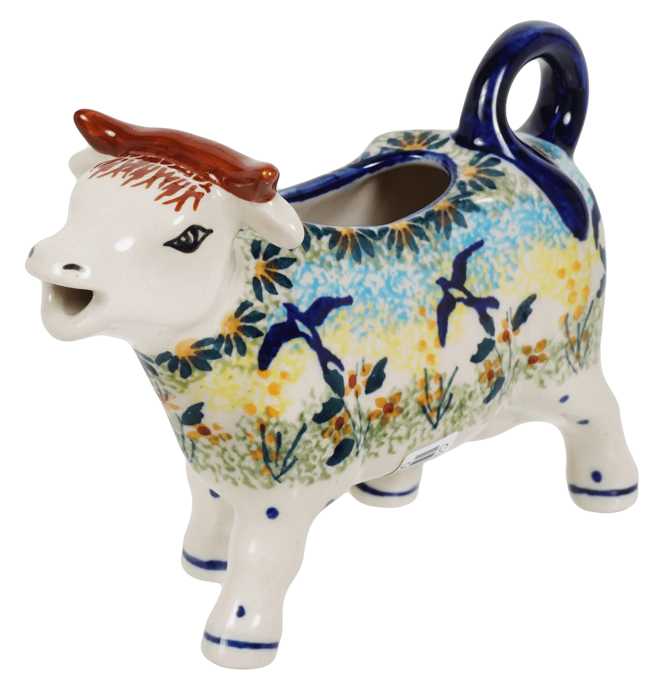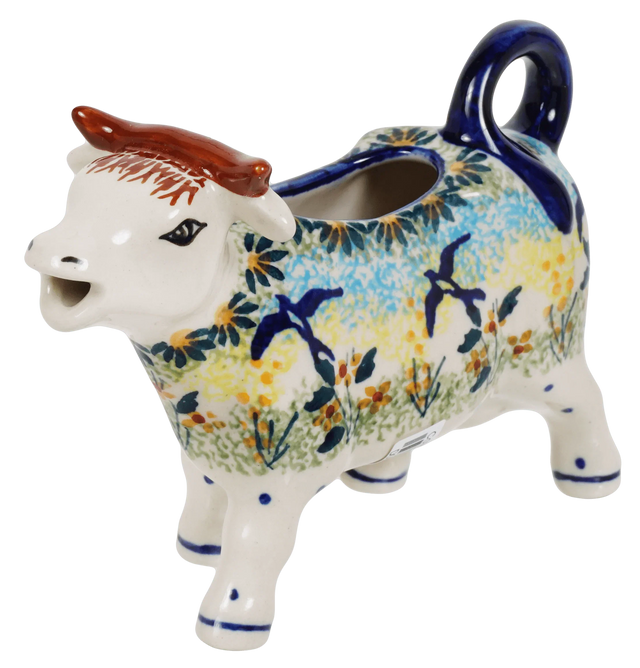 Introducing the charming Polish Pottery Creamer, a delightful piece that brings a splash of whimsy right to your table! Crafted by the skilled artisans at Manufaktura in Boleslawiec, Poland, this 4 oz creamer is not just a vessel for your cream; it's a tiny storyteller painted in the enchanting "Soaring Swallows" pattern. Picture this: each pour is a graceful flight, with birds gliding across a sky painted in shades of blue, their wings spread wide over a field of tiny yellow flowers and lush green fronds. It's a scene that captures the essence of a serene meadow at dawn, right on your breakfast table!
