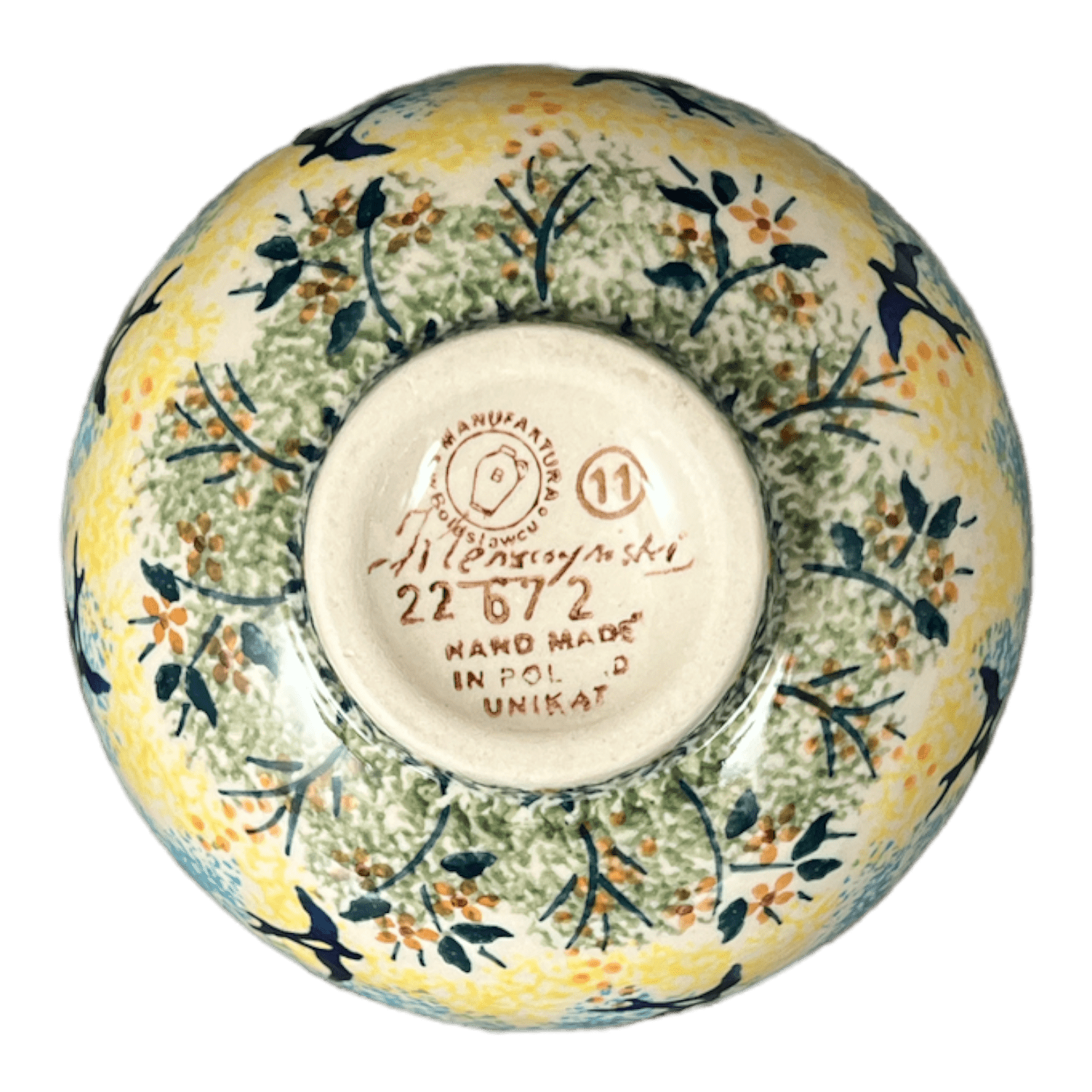 Handcrafted in the heart of Boleslawiec, Poland, by the skilled artisans of Manufaktura, each bowl is a testament to a tradition of craftsmanship that began in 1992. These artisans don’t just make pottery; they breathe life into clay, ensuring every detail from the tiny flowers to the fluttering swallows is perfect. The "Soaring Swallows" pattern is not only a delight to behold but also a Signature series item, which means it’s crafted by artists who have reached the pinnacle of pottery perfection. These master artists oversee each step of the creation process, from design to the final brush stroke, resulting in a limited supply that makes these bowls highly coveted collector’s items, complete with the unique "UNIKAT" stamp and the artist's signature on the bottom.