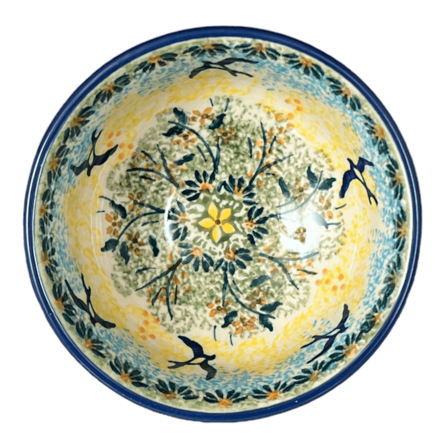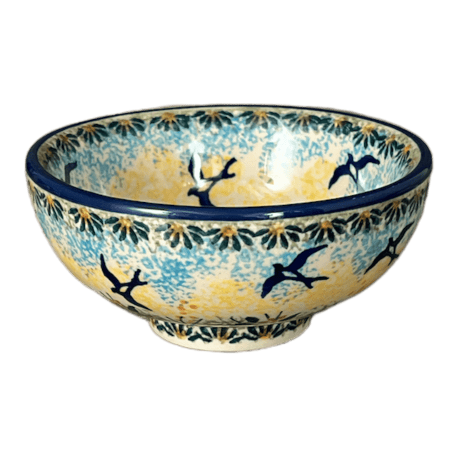 Imagine a tiny canvas that captures the essence of a breezy spring morning; that's exactly what the Manufaktura Polish Pottery Bowl in the "Soaring Swallows" pattern offers. Each 4.25-inch dipping bowl is a swirl of vibrant colors and delightful scenes, featuring playful birds and delicate flowers set against a whimsical blue sky. The intricate design incorporates a predominantly blue color palette with cheerful splashes of yellow and green, making each bowl not just a dish, but a piece of art. Small yellow flowers and thin green fronds dance in the center, surrounded by tiny clusters of orange dots and teal leaves, all beautifully framed by dark blue swallows in flight. This exquisite pattern transforms every dip and nibble into a fanciful flight of taste and style.