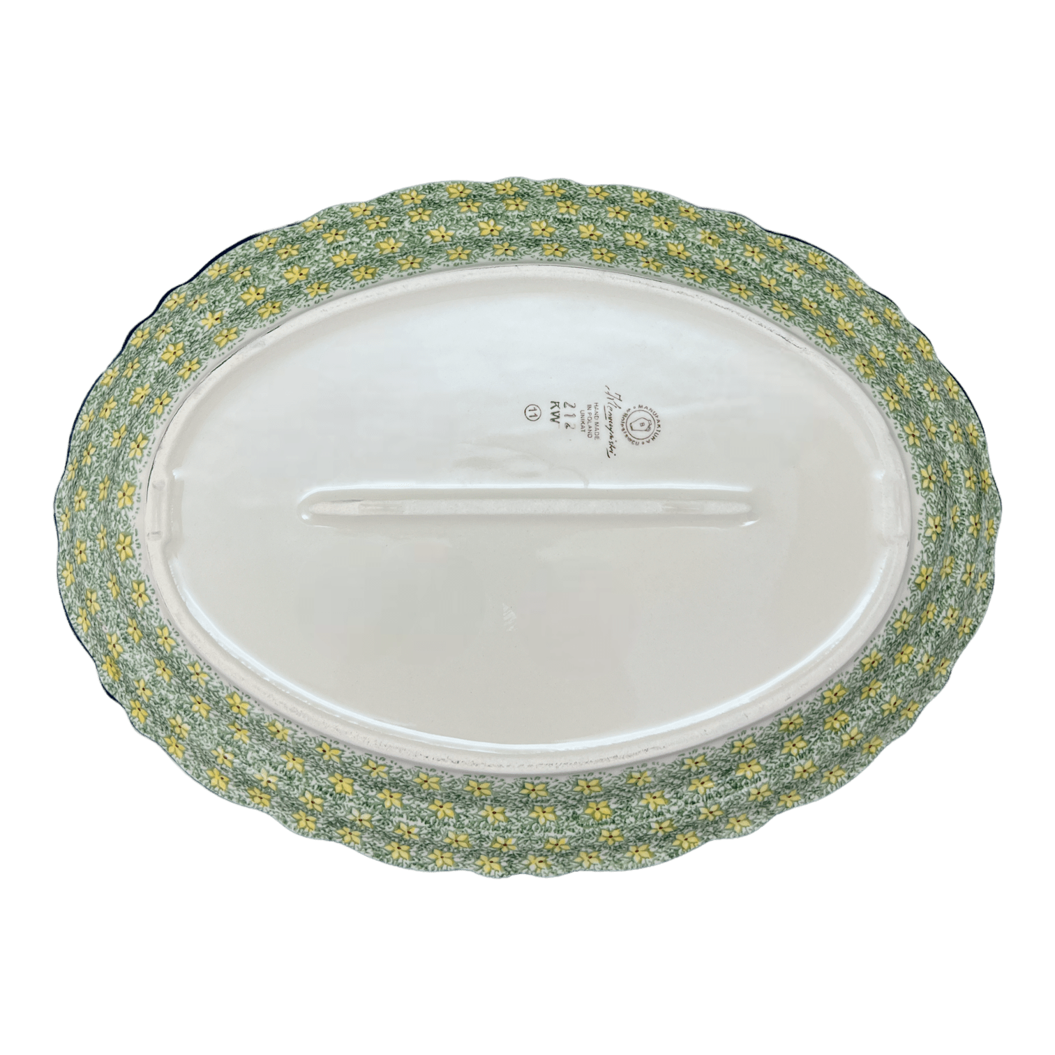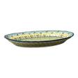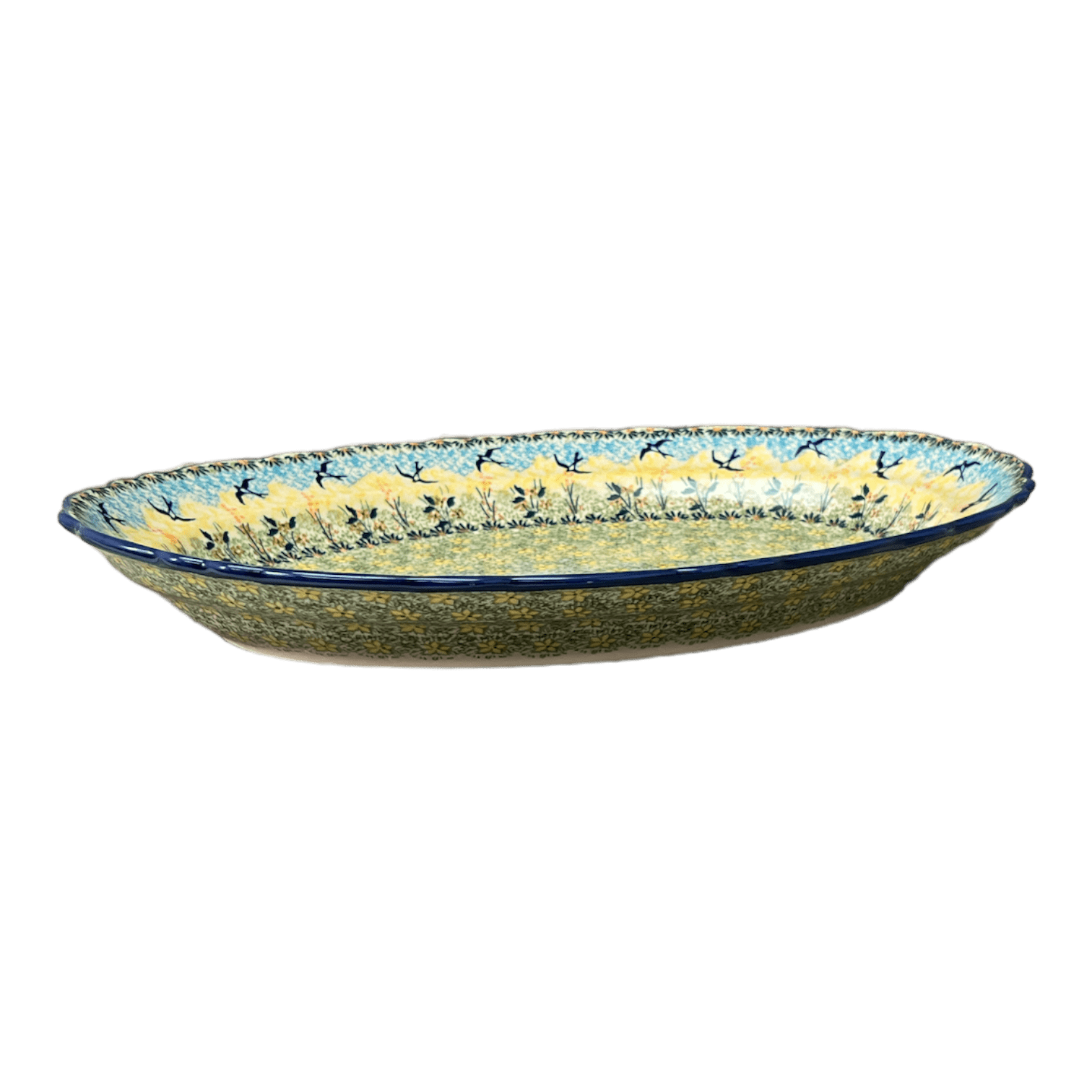 Imagine serving your next gourmet feast on a masterpiece that doubles as a conversation starter. Introducing the stunning Polish Pottery Platter from Manufaktura, an oval, scalloped gem that's not just a dish but a display of artisan craftsmanship. At a generous 16.75" x 12.25", this large platter is perfect for presenting your main course with flair. The "Soaring Swallows" pattern, a canvas of blue skies dotted with vibrant birds and blossoms, turns every meal into a festive occasion. Crafted in the historic town of Boleslawiec, Poland, each platter is hand-painted by skilled artisans, ensuring that no two pieces are exactly alike.