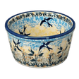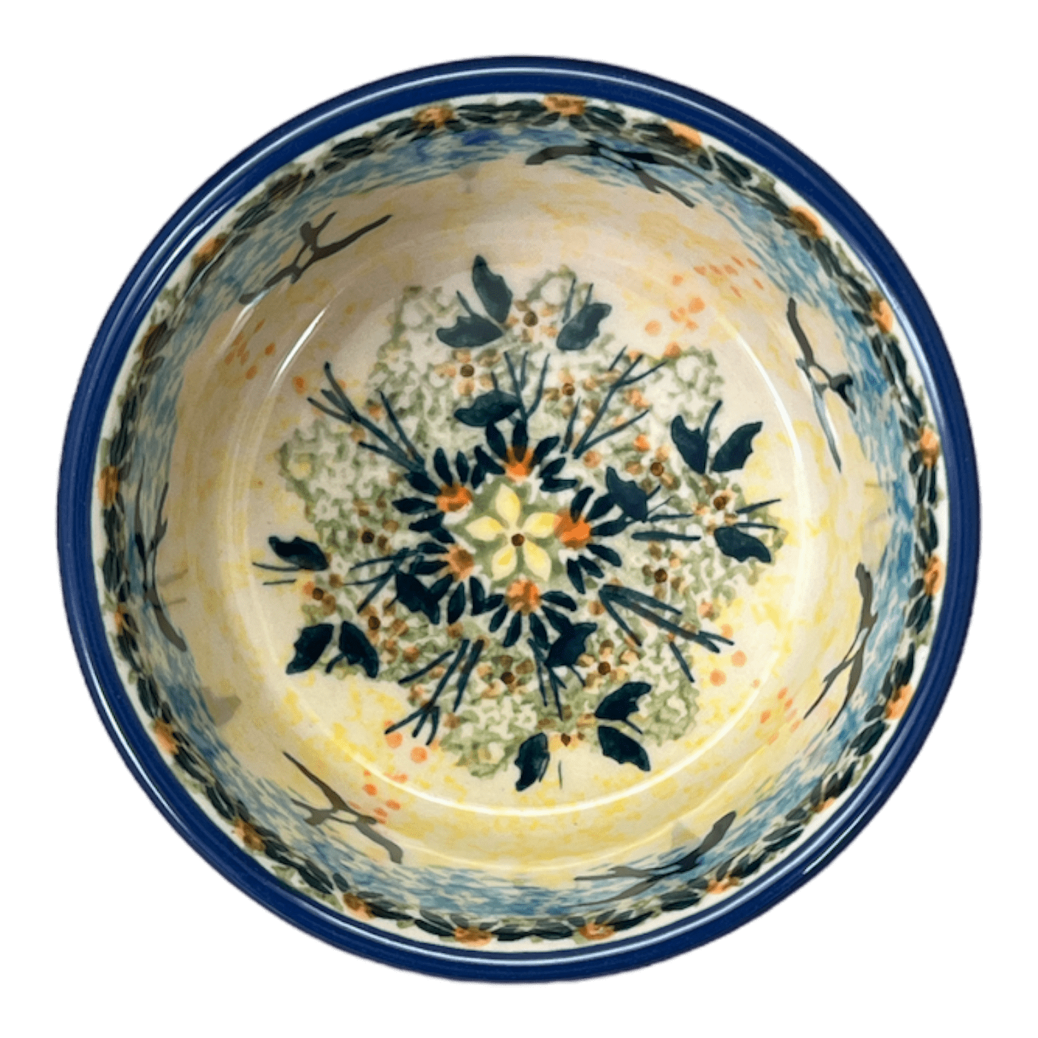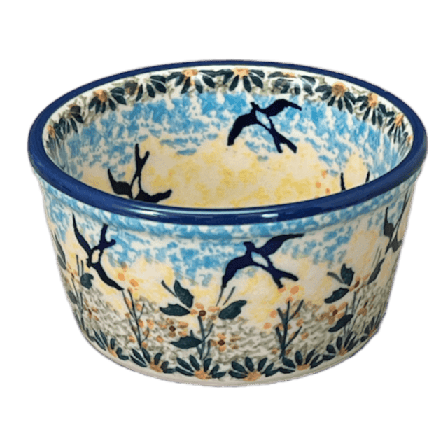 Introducing the enchanting Polish Pottery Ramekin from Manufaktura, featuring the delightful "Soaring Swallows" pattern. This 7 oz marvel is not just a ramekin, but a piece of art that brings the joy of spring right into your kitchen! Perfect for an array of culinary creations, from zesty dips and savory condiments to luscious custards and fluffy soufflés, these ramekins turn any meal into a festive feast. The vibrant design showcases a dance of dark blue swallows in flight, set against a canvas of sunny yellows and lush greens, interspersed with charming yellow flowers and teal leaves, making each piece a vivid portrayal of craftsmanship.