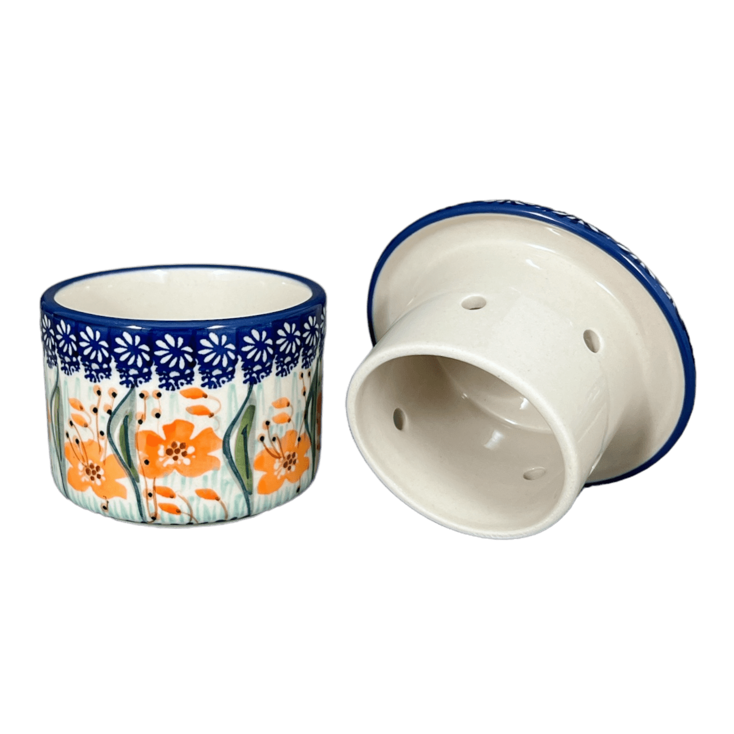 The "Sun-Kissed Garden" pattern is a testament to the mastery of Manufaktura's artisans. With a vivid play of orange flowers encircling a deep blue backdrop adorned with delicate white blossoms, each piece tells a story of skill and passion. This particular design reaches the pinnacle of artistry, known as the Signature level, where artists with exceptional talent oversee their creations from start to finish. Each crock is not just a container; it's a limited edition treasure, bearing the "UNIKAT" stamp and the artist's signature, ready to dazzle your dinner guests or add a touch of elegance to your daily routine.