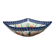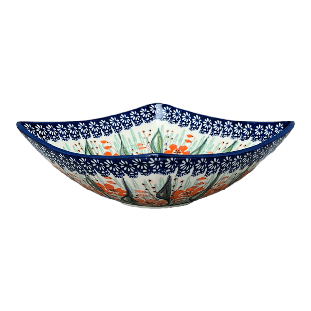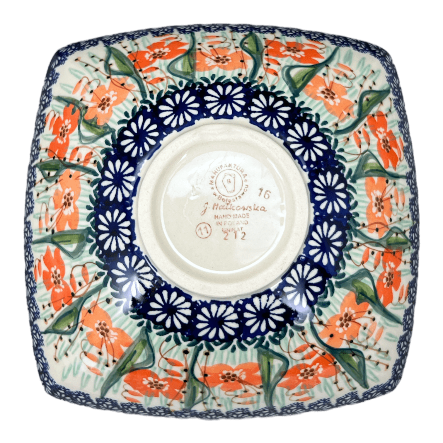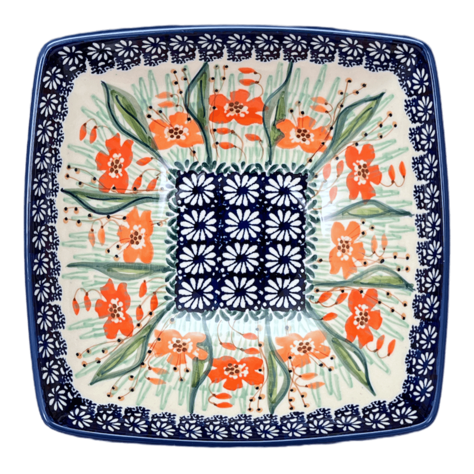 Imagine a piece of art so vibrant and unique that it instantly becomes the centerpiece of any room. Introducing the Polish Pottery Bowl from Manufaktura, a masterpiece crafted in the heart of Boleslawiec, Poland. This exquisite medium-sized, 7.75" square nut bowl is not just a dish; it's a declaration of style and a splash of color that brightens your home decor. Perfectly sized to nestle by your sofa for those nail-biting sporting events, or as a charming addition to your dinner table, this bowl combines functionality with sheer beauty. Its "Sun-Kissed Garden" pattern, featuring a dance of small white flowers against a deep blue backdrop and encircled by vibrant orange flowers and lush green grass, brings the joy of a sunny day right into your living space.