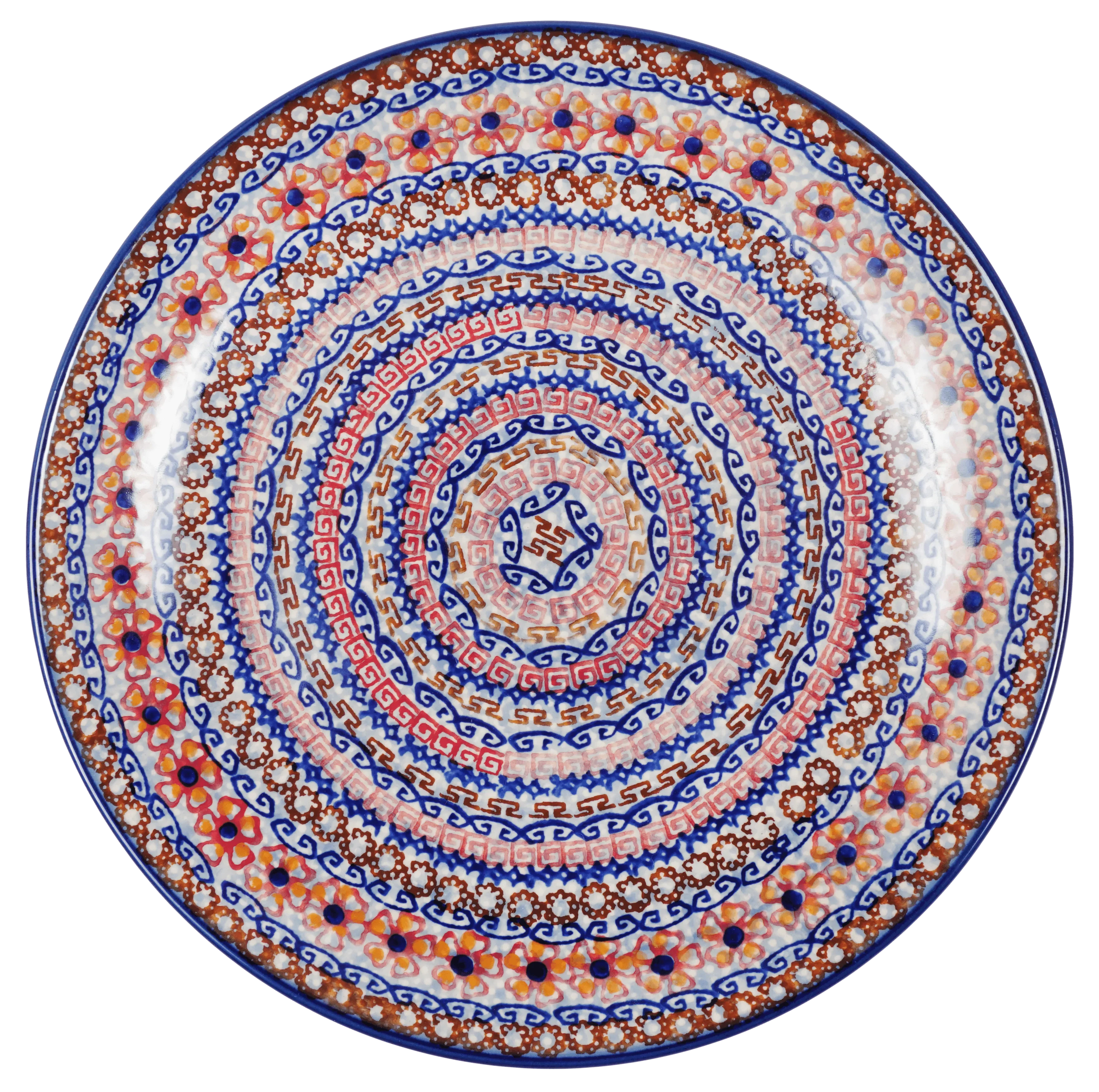Imagine setting your table with the enchanting charm of the Manufaktura 10" Dinner Plate from the "Sweet Symphony" collection. This isn't just any dinner plate; it's a canvas where culinary meets creativity. The vibrant pattern of flowers and geometric shapes, predominantly in soothing blues with lively accents of red and brown, brings each meal to life. Each plate features intricate, detailed bands of red, gold, and blue that radiate from the center against a light blue backdrop. This plate isn’t merely for dining; it’s for savoring each bite amidst a masterpiece of color and design.