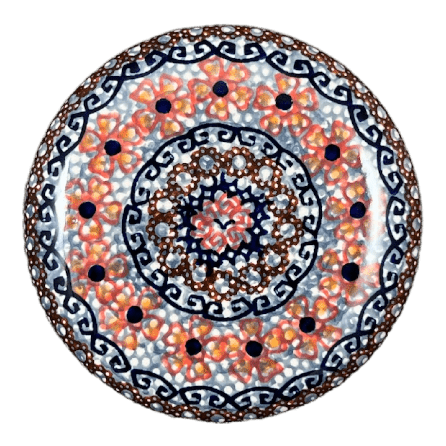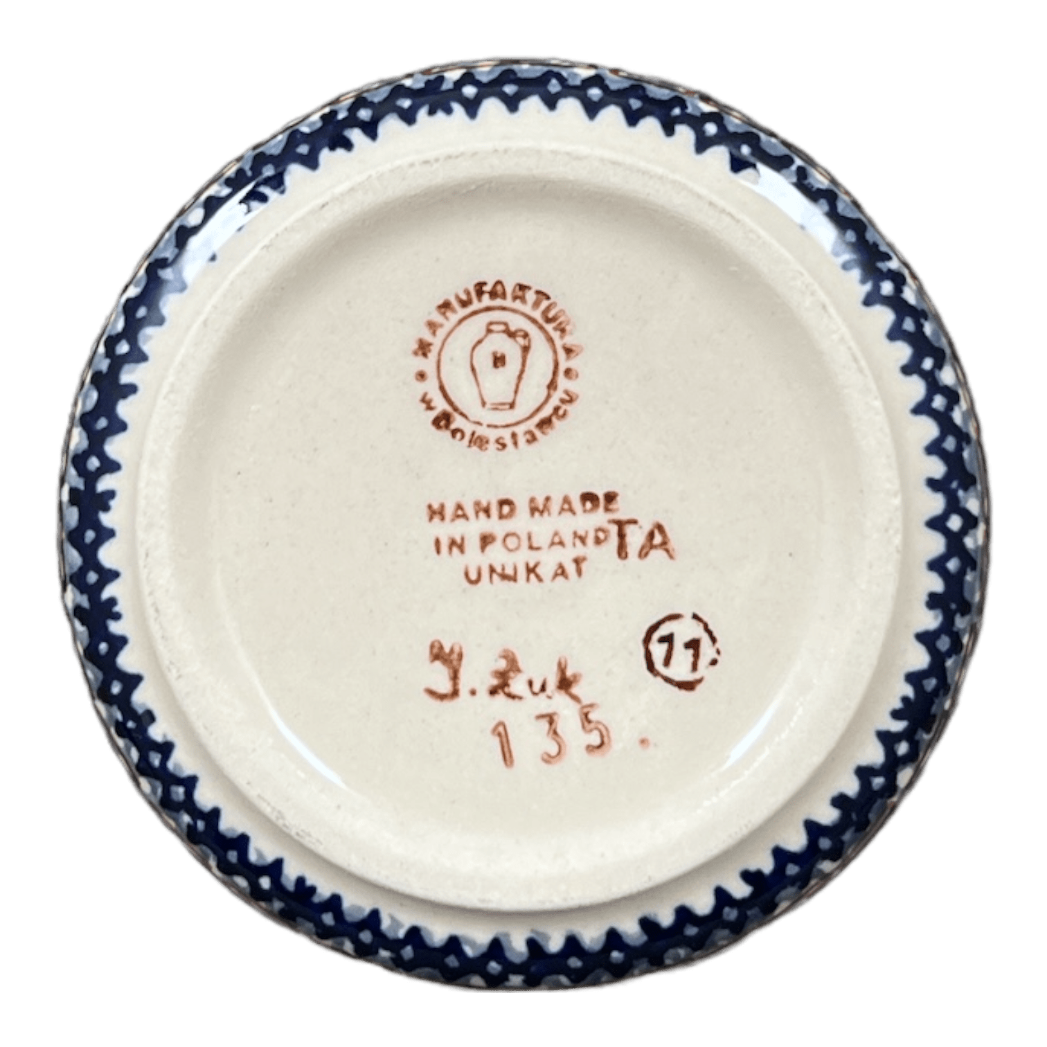 But let's talk about the design - the "Sweet Symphony" pattern that adorns this crock is nothing short of a visual feast. It features an exquisite blend of floral motifs and geometric patterns, predominantly in soothing shades of blue with lively accents of red and brown. Intricate bands of red, gold, and blue unfurl from the center against a light blue backdrop, each detail painstakingly hand-painted by skilled artisans. This pattern isn’t just pretty; it’s a signature design, which means it comes from the highest echelon of artistic achievement at Manufaktura. Artists who reach this level oversee every step of their creations, from the initial design to the final brush stroke, making each piece a limited edition and a collector’s dream adorned with the coveted "UNIKAT" stamp and the artist’s own signature.
