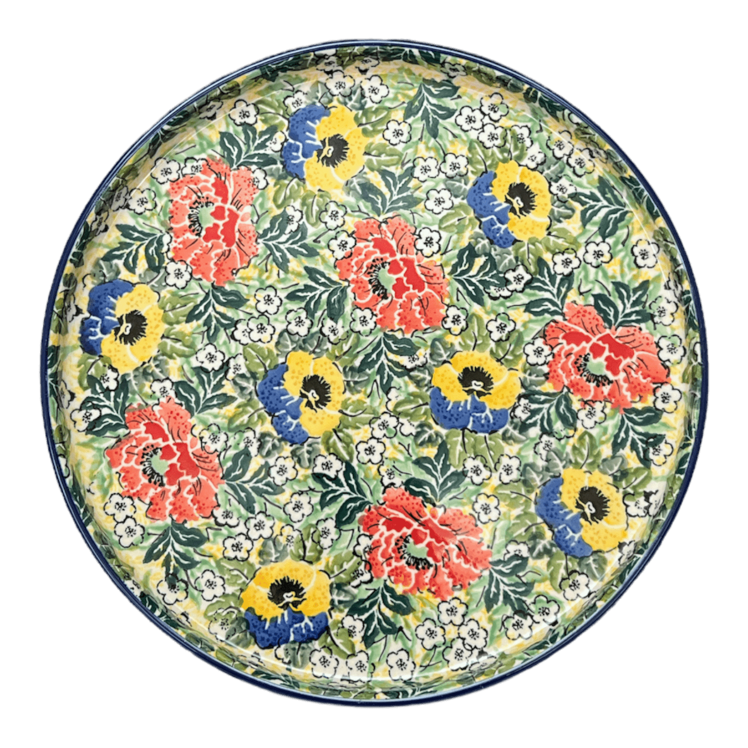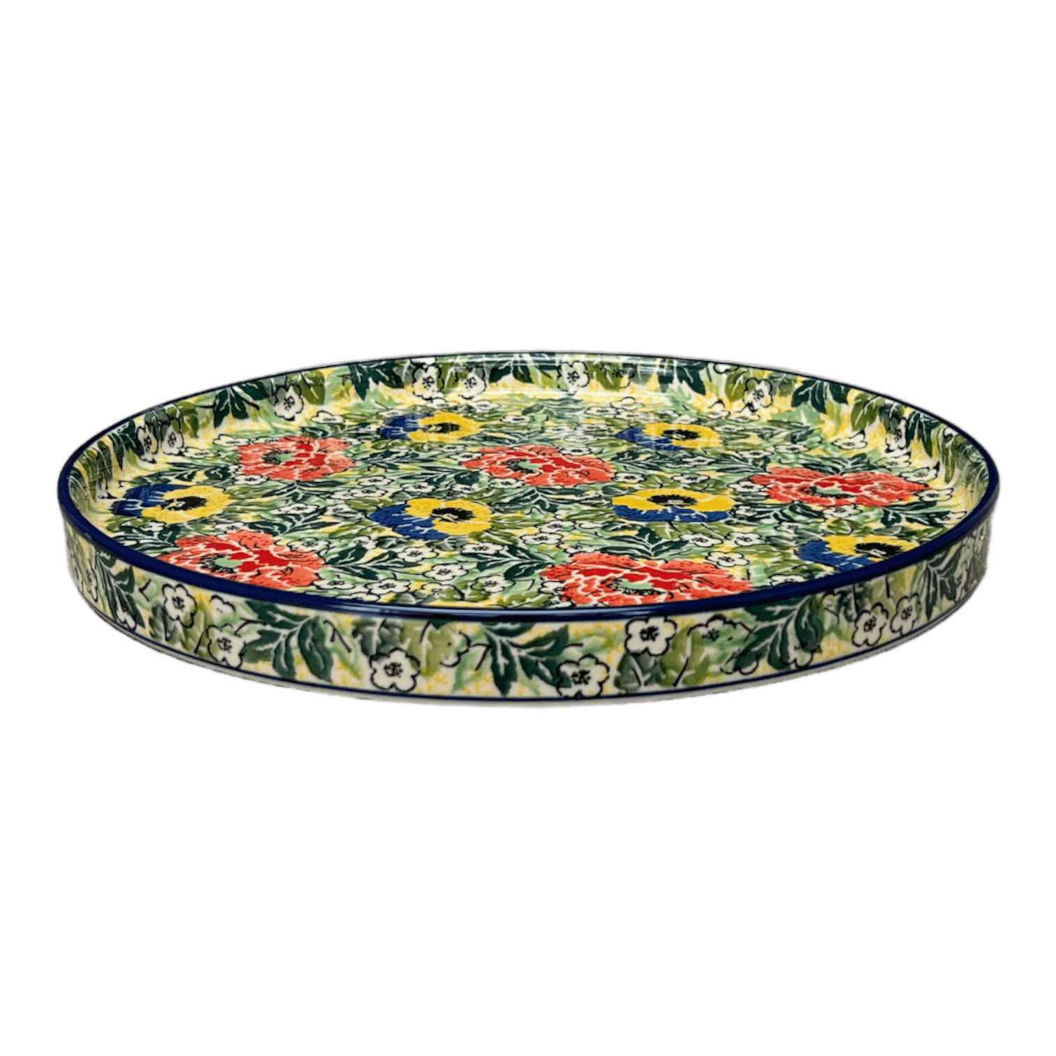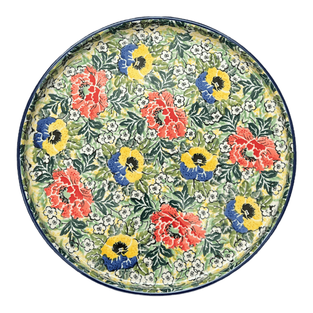 Step into a world where vibrant colors meet unparalleled artistry with the Polish Pottery Tray in the "Tropical Love" pattern. This exquisite 10" round tray is not just a dish, but a portal to a tropical paradise, designed by the renowned artisans of Ceramika Artystyczna. Picture a lush tableau of large red, yellow, and blue flowers blooming boldly against a backdrop of verdant green leaves, interspersed with charming little white flowers. This stunning pattern is aptly named "Tropical Love," evoking the feel of an endless summer. Hand-painted with meticulous care, each tray is a unique masterpiece, showcasing the zenith of craftsmanship that Ceramika Artystyczna is celebrated for worldwide.