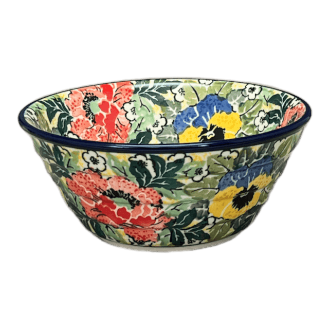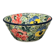 Imagine a splash of vibrant colors and exquisite patterns right at your dinner table with the Polish Pottery Bowl from Ceramika Artystyczna. This delightful 5.5" round, ridged bowl is not just a dish but a canvas featuring the "Tropical Love" pattern. Bursting with large red, yellow, and blue flowers set against a lush background of green leaves and dainty white blossoms, it brings the essence of a tropical paradise into your home. Perfect for serving everything from refreshing fruit salads to rich, creamy desserts, this bowl turns every meal into a festive occasion.