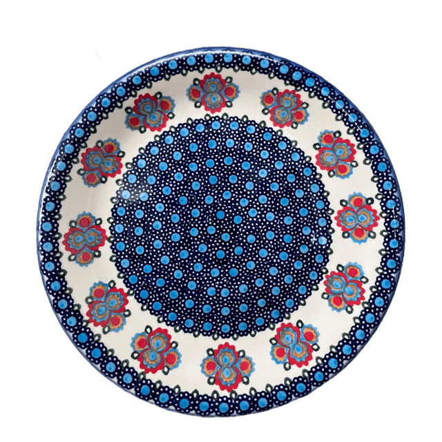 Imagine a piece of art that you can dine off! Introducing the enchanting Polish Pottery Plate, a 7.5-inch round dessert marvel, meticulously crafted by the renowned artisan Andy in the delightful "Polish Bouquet" pattern. This plate isn't just a dish; it's a portal to a world of vibrant traditions, featuring an intricate design of flowers and dots predominantly in shades of blue with cheerful accents of light blue and red. The border and center of the plate are adorned with small blue flowers with light blue centers, encircled by a ring of multi-colored flowers that dance around the core. This design, rooted in the traditional artistry of Polish pottery, invites the charm of Eastern European craftsmanship right to your table.