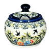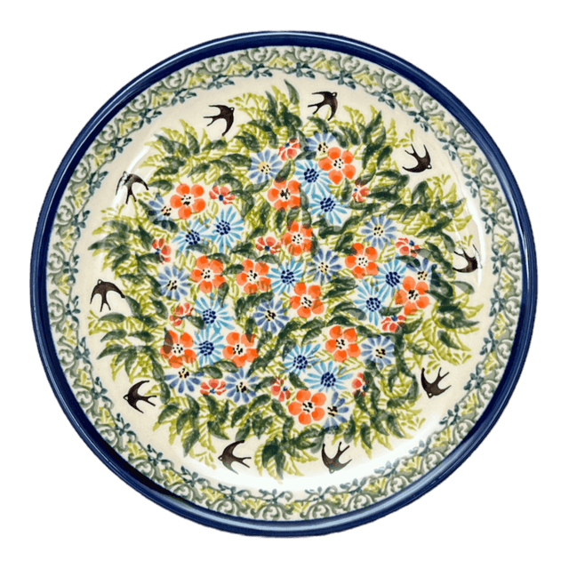 Step into a world of exquisite artistry with the Polish Pottery Plate, expertly crafted by the artisans at Zaklady in the charming town of Boleslawiec, Poland. This delightful 7.75" dessert plate is more than just a dish; it's a canvas showcasing the vibrant "Floral Swallows" pattern. Picture this: black swallows gracefully circling a vivid explosion of orange, blue, and red flowers, all nestled among lush green leaves. The predominantly light blue background, sprinkled with dashes of green, orange, and red, makes each meal a visual feast, turning your dining experience into an enchanting escape.
