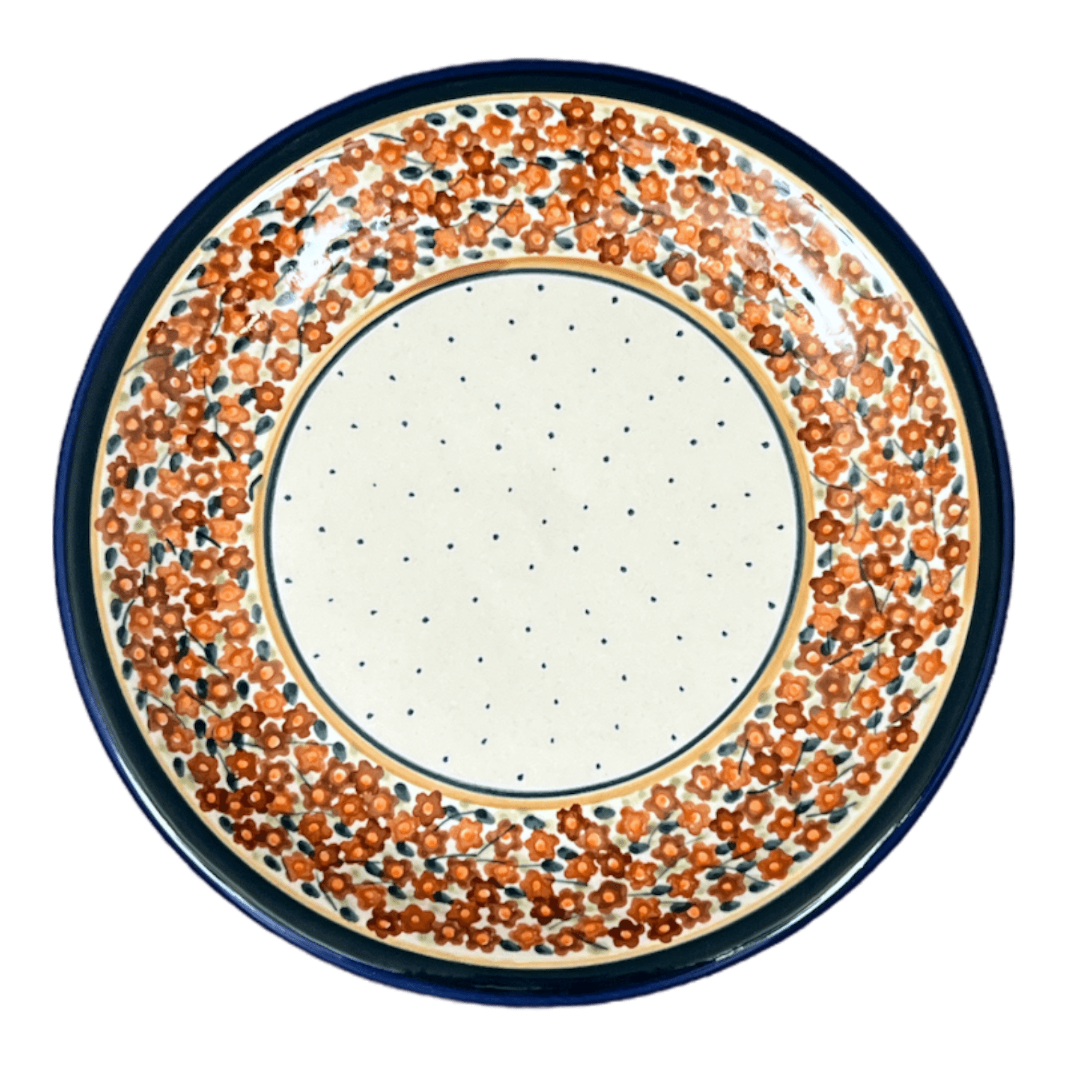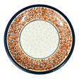 Imagine your dining table adorned with the vibrant charm of the Zaklady Polish Pottery Plate, a masterpiece that transforms every meal into a celebration. This 9.5" round plate, lovingly crafted in the heart of Boleslawiec, Poland, features the captivating "Orange Wreath" pattern. Picture a ring of exquisite brown, orange, and gold flowers, intertwined with lush green leaves encircling the rim, while the center dazzles with a constellation of tiny brown dots against a pristine white backdrop. This isn't just dinnerware; it's a piece of art that promises to enchant your guests and elevate your dining experience.