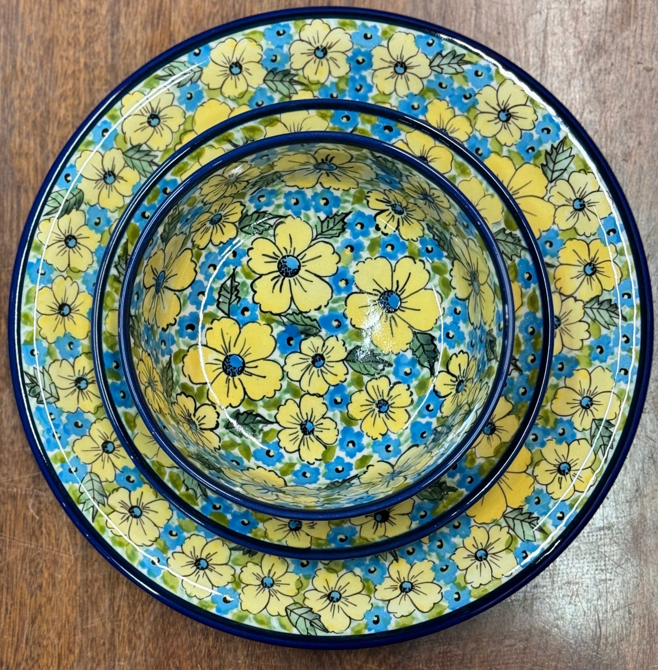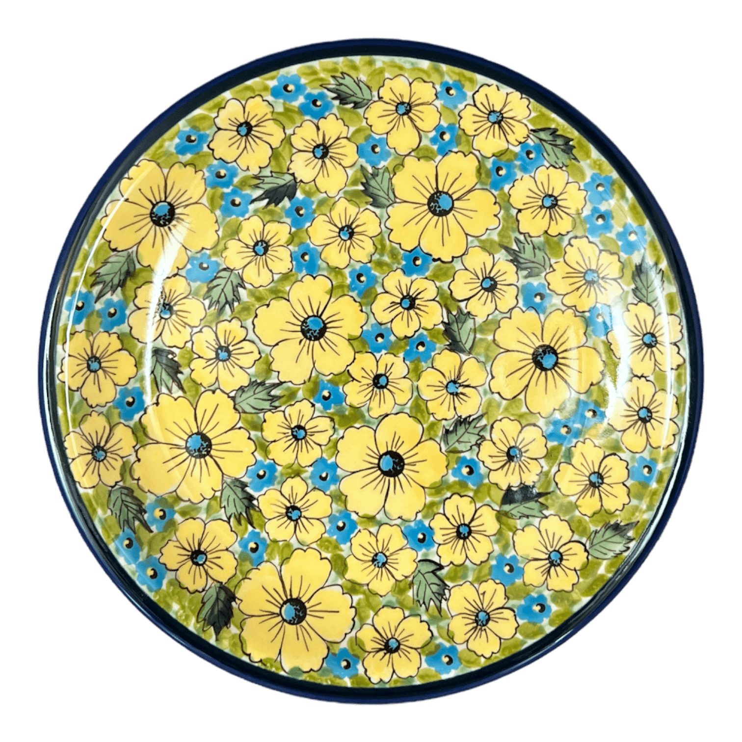 Imagine a dinner plate that not only serves your favorite meals but also tells a story of artistry and tradition. That's exactly what the Zaklady Polish Pottery Plate in the "Sunny Meadow" pattern offers. Picture this: a bright canvas of large yellow flowers and petite blue blooms, beautifully arranged against a vibrant green, leafy backdrop. Each 9.5" plate is a round masterpiece, crafted to transform your dining experience into an enchanting floral festivity. Hand-painted in Boleslawiec, Poland, these shallow dinner plates merge impeccable art with everyday dining, making even a small meal feel like a celebration.