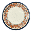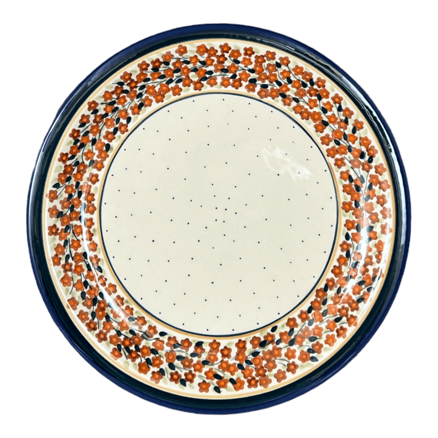 Imagine a dinner plate that does more than just serve food; it serves up a piece of art right at your table! Introducing the stunning 10.75" Polish Pottery Plate from Zaklady, crafted in the captivating "Orange Wreath" pattern. This isn't just any ordinary plate. It features a mesmerizing design with a symphony of colors - brown, orange, green, and white - dancing in harmony. The central white canvas is sprinkled with tiny brown dots, surrounded by a vibrant ring of flowers and leaves, creating a visual feast that's as delightful as the dishes you'll serve on it.