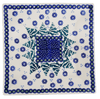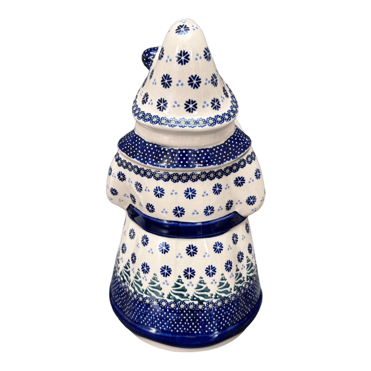 Imagine a Christmas scene straight out of a storybook with the enchanting Polish Pottery Cookie Jar, Santa, 12", crafted by the renowned artisans at Manufaktura. This delightful jar features the "Snowy Pines" pattern, where jolly old Saint Nick himself seems to dance among a wintry forest. The jar's vivid blue background is sprinkled with tiny white dots, evoking the serene beauty of falling snow, while a band of teal Christmas trees wraps around the center, creating a magical holiday vibe. Above, the sky is adorned with simple yet charming blue snowflakes, all hand-stamped using the traditional "punching" technique that showcases the skill of highly skilled Polish craftsmen.