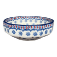 Introducing the enchanting "Snowflake Love" Polish Pottery Bowl from Manufaktura, a masterpiece that blends function with whimsical artistry. This delightful multiangular bowl, measuring 5 inches across and 1.75 inches high, is the perfect vessel for anything from your favorite dips and sides to your cherished jewelry pieces. Crafted in the heart of Boleslawiec, Poland, by highly skilled artisans, this piece showcases the charming "Snowflake Love" pattern—tiny blue snowflakes playfully scattered on a pristine white background, bordered by a sequence of petite red and blue hearts. The vibrant colors and intricate design are sure to add a touch of magic to your home decor.