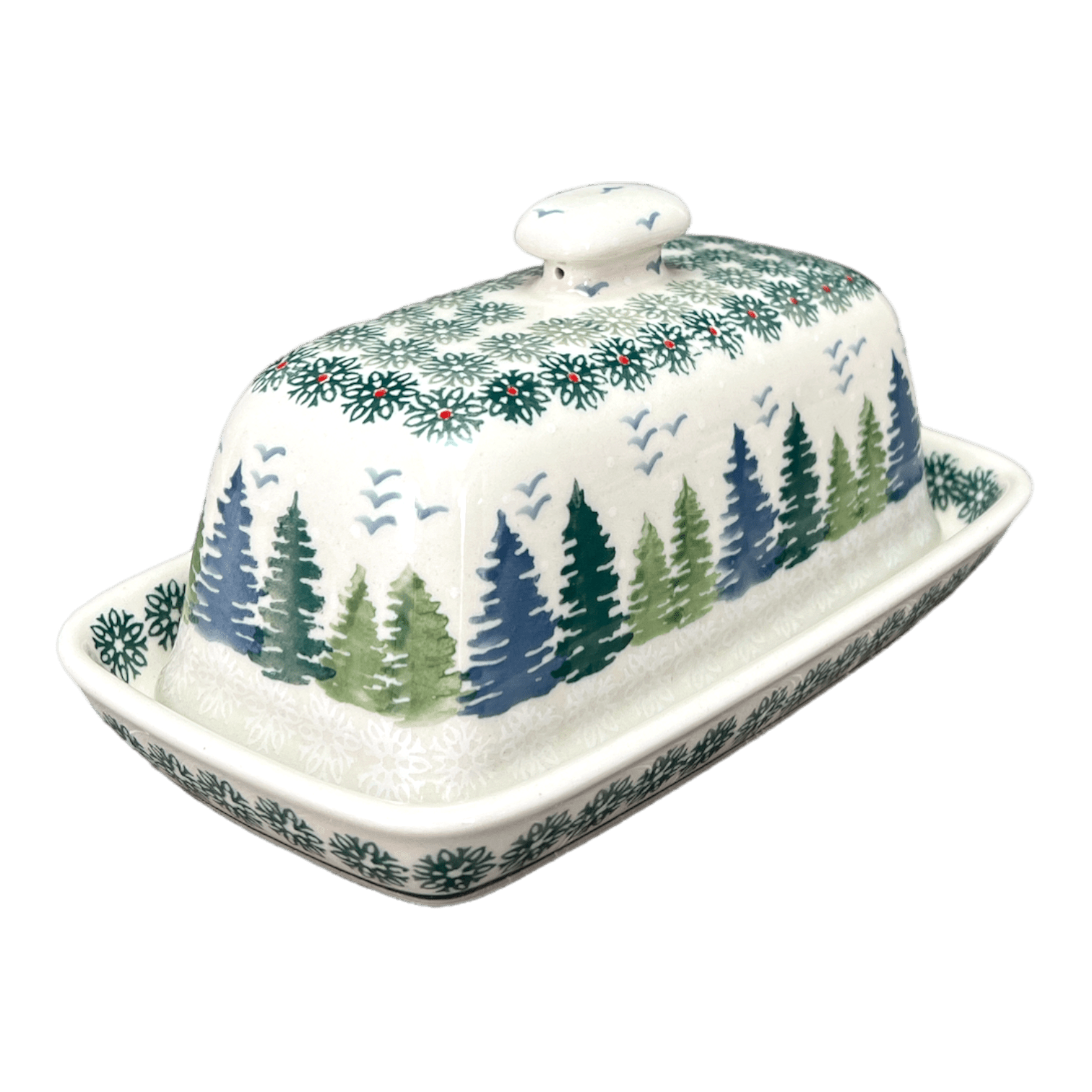 Imagine a quaint cabin nestled in a winter wonderland, the air crisp and the scent of pine in the breeze. Now, bring a piece of that serene forest into your kitchen with the Manufaktura Polish Pottery Butter Dish in the enchanting "Pine Forest" pattern. This dish isn't just a container; it's a portal to a snowy, peaceful forest. Adorned with a symphony of green snowflake-shaped flowers, bordered and centered around a delicate ring of green and dusty blue pine trees, this pattern captures the essence of a tranquil winter forest. Small birds flutter in the background, completing this picturesque scene, all beautifully laid on a pristine white canvas.