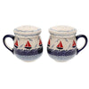 Imagine transforming your dining table into a whimsical forest with the enchanting Manufaktura Polish Pottery Salt & Pepper Shakers in the "Pine Forest" pattern. Each mug-shaped shaker is a canvas showcasing a serene wintery forest scene, complete with delicate snowflake-shaped flowers and rings of majestic green and dusty blue pine trees. The scene is beautifully accented by the gentle flutter of birds in a snowy white background. These charming pieces aren't just functional; they're tiny masterpieces that invite the magic of a frosty, serene forest into your home.