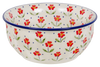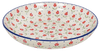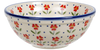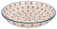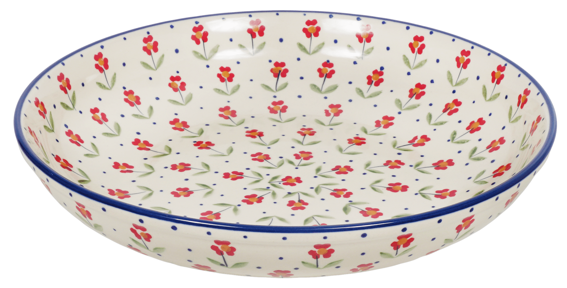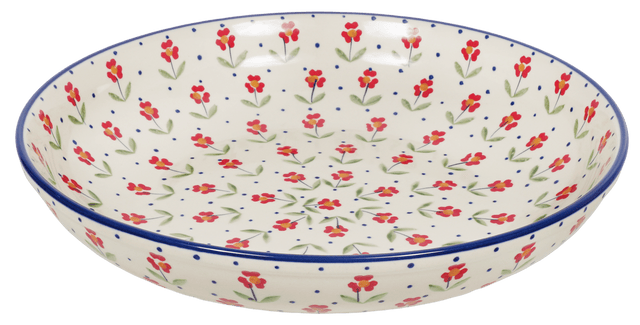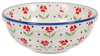 Introducing the enchanting Polish Pottery Bowl from Manufaktura, a masterpiece that brings a touch of traditional elegance right to your dining table! With a generous 11.75-inch diameter and a shallow depth, this salad bowl is not just a vessel for your vibrant salads and hearty pastas, but a showpiece that boasts the exquisite "Simply Beautiful" pattern. Picture a canvas painted with delicate red flowers, their slender stems and tiny green leaves sprawling across a pristine white background, punctuated by playful blue dots. This traditional pattern, a favorite among connoisseurs of Polish pottery, captures the essence of nature's simplicity and beauty.