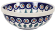 The "Peacock" pattern is a traditional design that showcases the artistry and craftsmanship of highly skilled Polish artisans. Using the hand-stamping technique known as "punching," each bowl is meticulously painted with intricate details inspired by nature. The large cluster of peacock circles on a blue background, along with teal green petals against a white backdrop, create a visually stunning piece that is both unique and timeless.