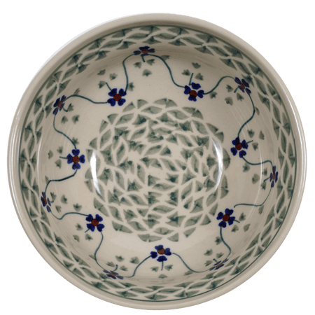 The "Woven Pansies" pattern is a true work of art. Picture delicate flowers in shades of green, white, and blue, dancing across a white background. A thin band of charming blue and orange flowers encircles the center, connected by a slender green vine. And let's not forget about those adorable little green leaves that sprout from the flowers. This pattern is a shining example of Traditional level of artistry, which is the most common and recognizable in the world of Polish pottery.