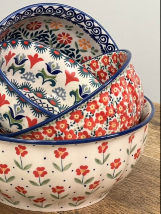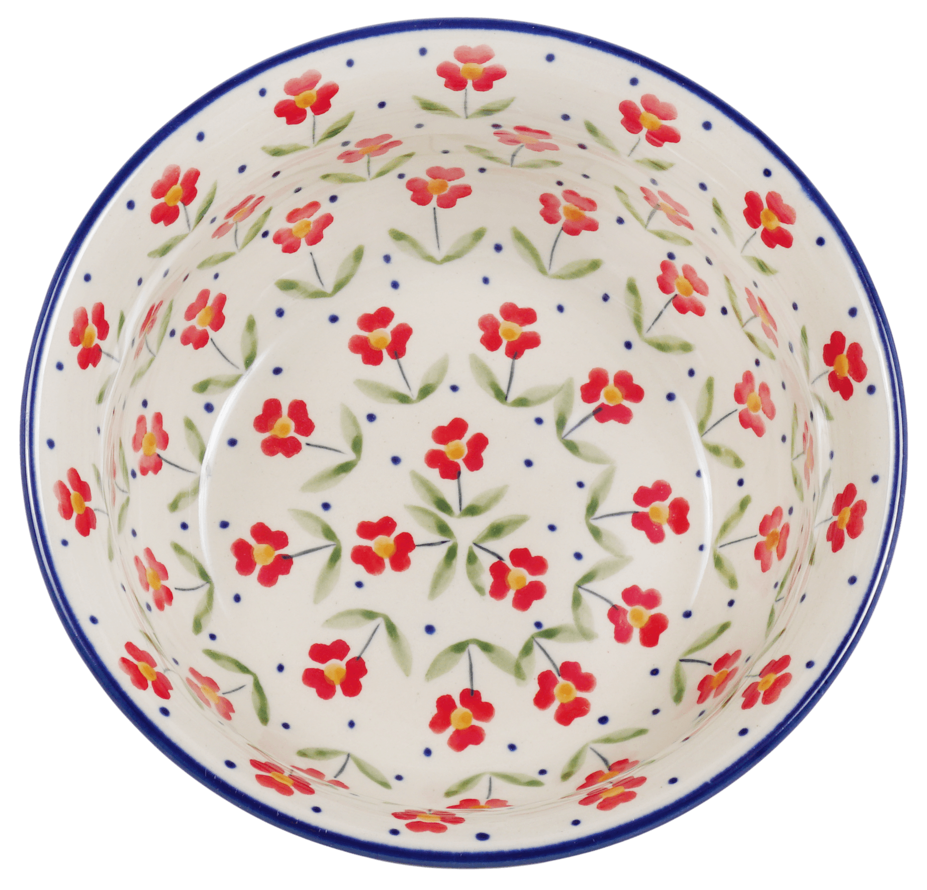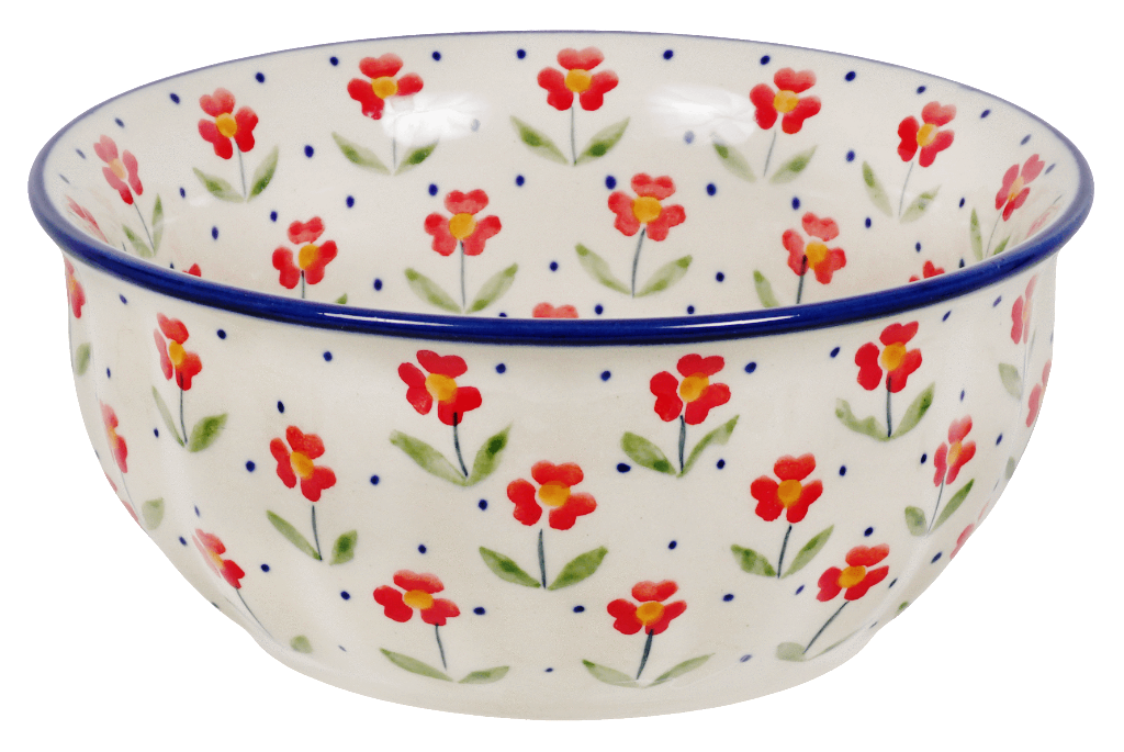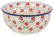 The "Simply Beautiful" pattern adorning this bowl is a testament to the traditional artistry of Polish pottery. Decorated with a dance of small red flowers linked by delicate green stems and accented by playful blue dots, this design captures the essence of a blooming meadow under a clear sky. Each bowl is a canvas where highly skilled artisans employ the age-old "punching" technique of hand stamping, bringing to life the natural inspirations with a vibrant palette of colors. As these patterns are widely beloved, each piece varies slightly, adding a unique charm and a story to tell.