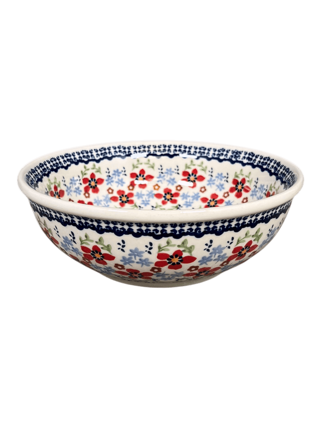 Imagine serving your guests a vibrant splash of summer with every dish! The Manufaktura 8.5" Polish Pottery Bowl in the dazzling "Summer Bouquet" pattern is your perfect canvas for culinary presentation. Crafted with joy in the heart of Boleslawiec, Poland, this generously sized bowl is ideal for tossing up fresh salads, presenting a heap of buttery mashed potatoes, or even dishing out a steamy, aromatic pho. Each bowl features a delightful array of red flowers, punctuated by playful blue and green accents, all set against a crisp white background sprinkled with blue dots—guaranteed to make your table setting pop!