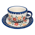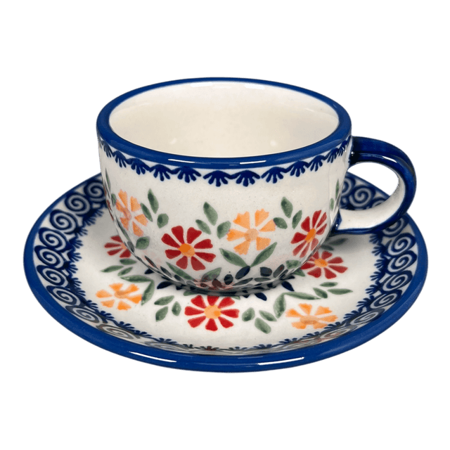 Step into a world where traditional artistry meets modern-day charm with the Polish Pottery Cup & Saucer from Manufaktura, showcasing the vibrant "Flower Power" pattern. This delightful set, perfect for savoring your favorite coffee or tea, features a lively design of red and orange flowers, complemented by playful swirls and a touch of green foliage, all set against a crisp white background. Each piece is a testament to the unique craft of Polish pottery, with its deep roots in the folk art traditions of Boleslawiec, Poland. The cheerful color palette and floral motif are sure to brighten your day and bring a smile to your face with every sip.