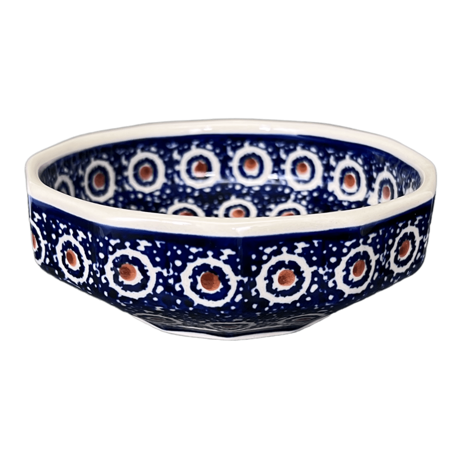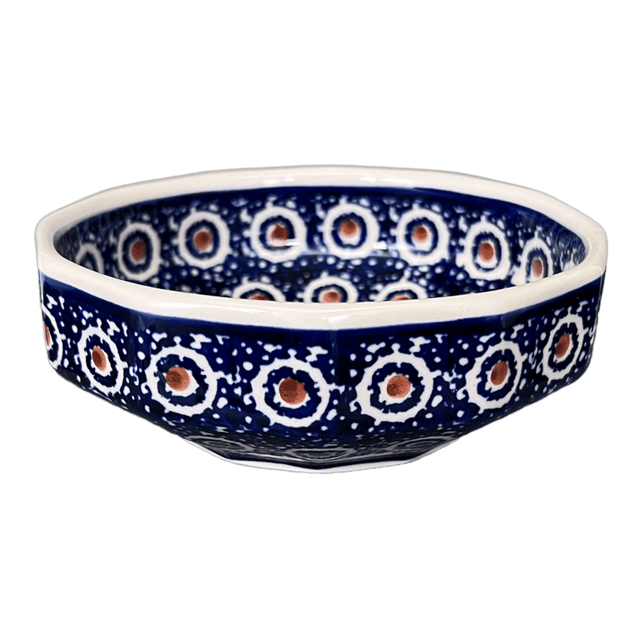 Introducing the Polish Pottery 5" Round Multiangular Bowl by Manufaktura in the delightful "Bee's Knees" pattern! These bowls are not only shallow and stylish, but also incredibly versatile. Whether you're serving up delicious dips, delectable sides, or even indulging in a sweet treat like ice cream or yogurt, these bowls have got you covered. But wait, there's more! These charming bowls can even double as a stylish storage solution for your jewelry collection. How's that for multifunctionality?