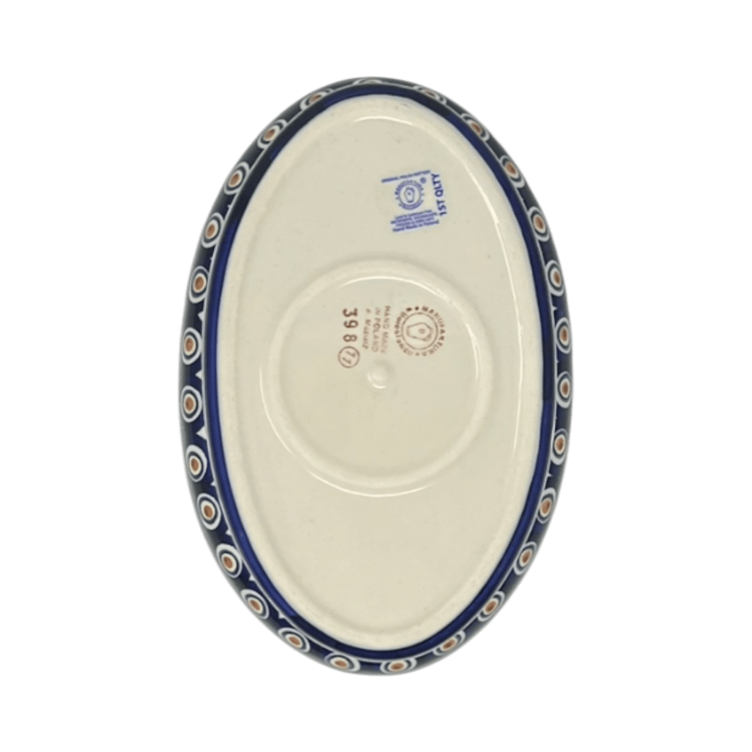 But this baker isn’t just about utility; it’s a piece of art. Adorned with the striking "Peacock" pattern, it features a dance of majestic peacock circles set against a rich blue backdrop, flanked by large, teal green petals that stretch out over a crisp white canvas. Each piece, hand-painted by highly skilled artisans in Boleslawiec, Poland, uses the traditional "punching" technique of hand stamping, bringing to life designs inspired by the natural world. As these patterns are considered traditional, they are widely recognized and cherished, making this baker a timeless addition to your kitchen collection or a thoughtful gift for someone special.